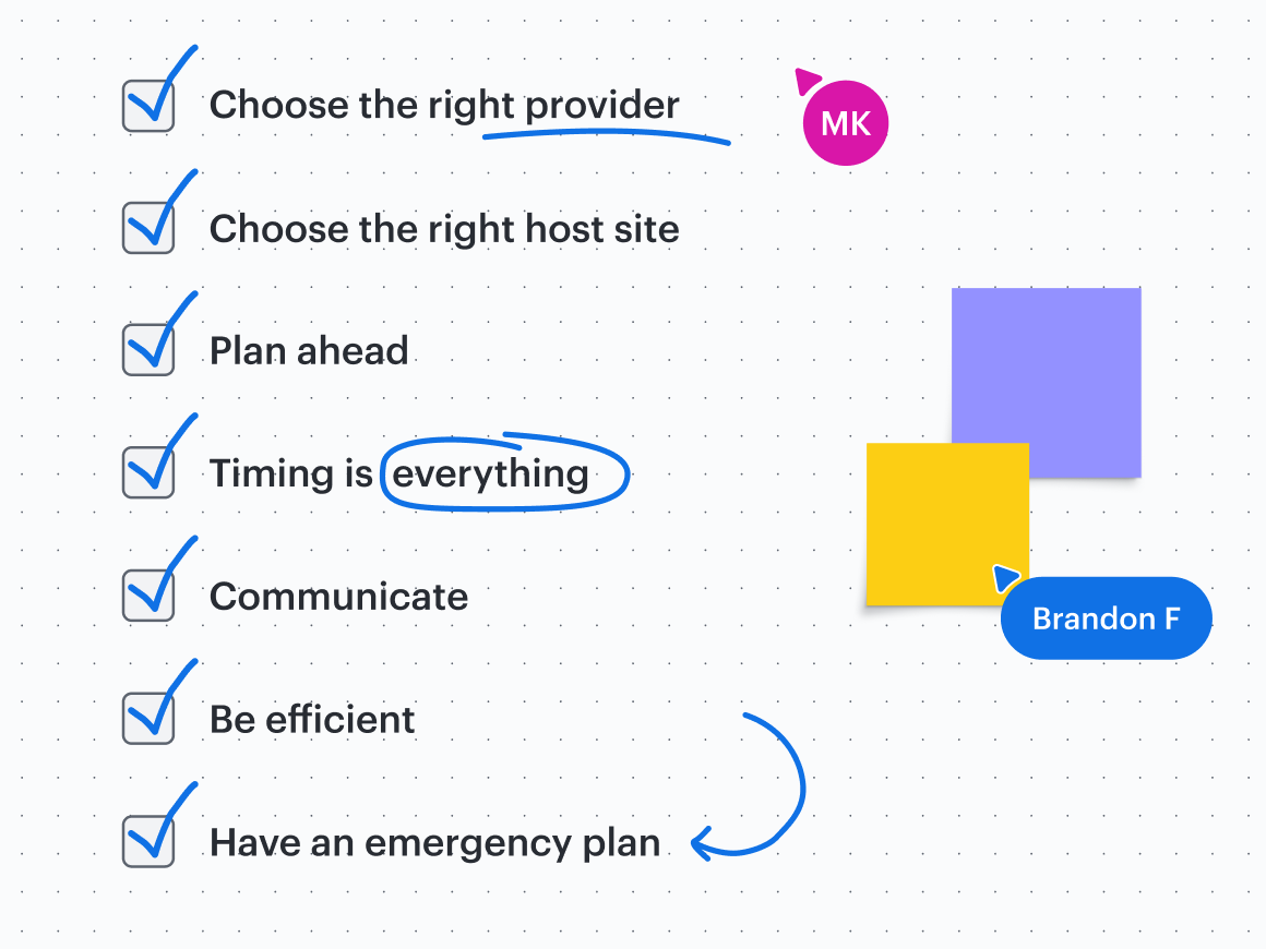 Say that the cloud migration process begins, and everything goes wrong. Who can your migration team call for help? Obviously, anticipating issues proactively is the best policy, but sometimes the unforeseen occurs: You'll need to develop a plan for this worst-case scenario. If something goes wrong, consider it a learning opportunity and conduct a post-mortem to incorporate lessons learned for later on. Using a work acceleration platform like Lucid will help you clearly visualize not only your cloud architecture but also your emergency plan.