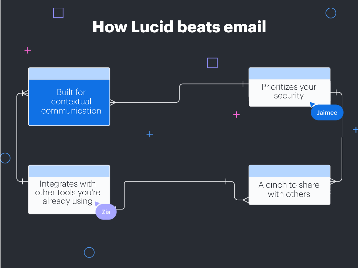 Consider Lucid as an email alternative. With integrations that leverage the work you’re already doing, countless features that clarify async communication, and version control your inbox could only dream of, you’ll empower team members with the solution that saves time and accelerates their work.