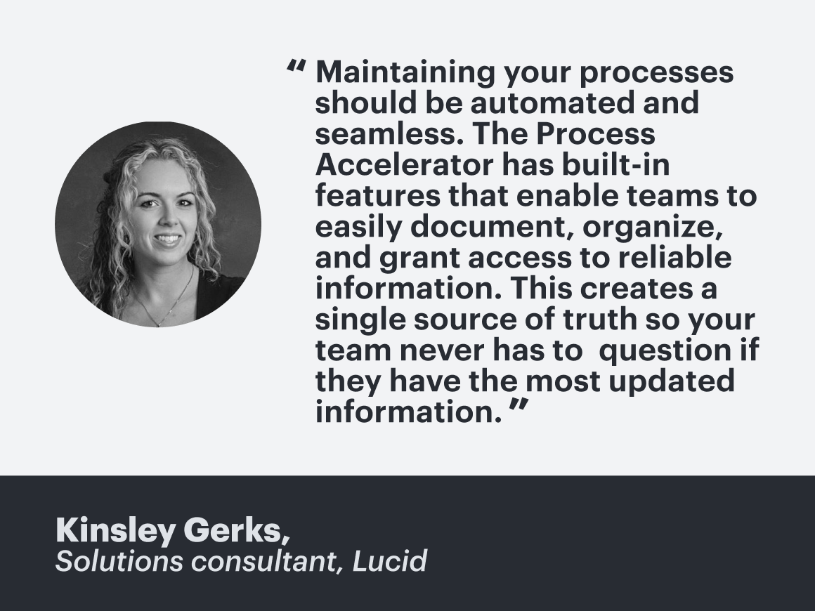 We sat down with Kinsley Gerks, solutions consultant at Lucid, to hear her tips and proven best practices for how she helps our customers create, structure, and maintain a process repository. Follow along to learn how you can make information more accessible within your organization and collaborate with confidence.