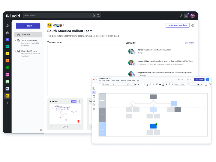More complete visual collaboration. Get two highly connected yet individually powerful applications. Keep your team working together with Lucidchart for intelligent diagramming and Lucidspark for virtual whiteboarding.