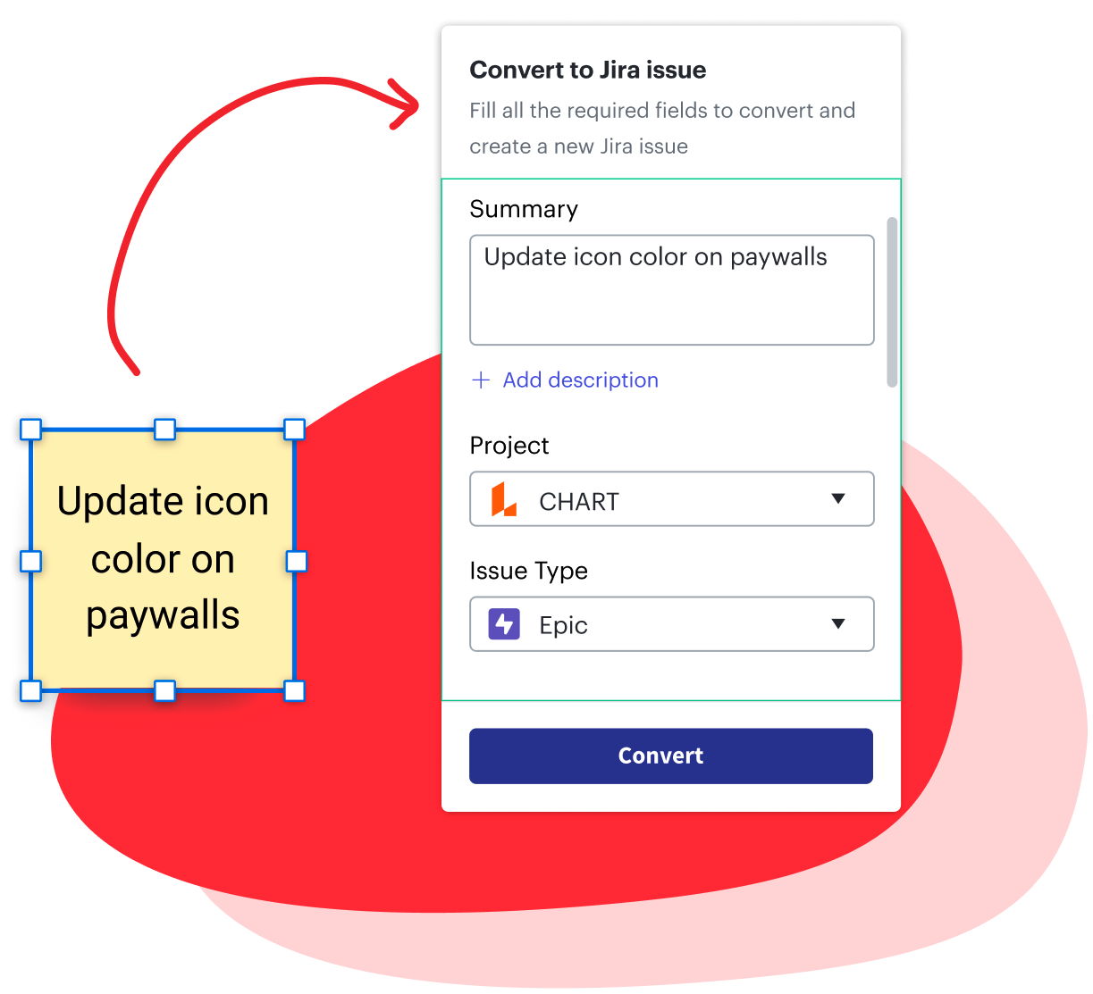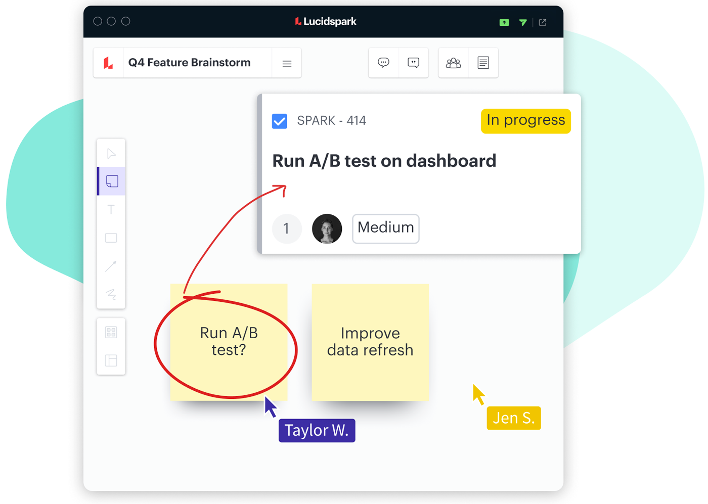 Halten Sie Brainstorming-Sitzungen ab, damit Ihnen keine Ideen entgehen. Verwandeln Sie daraufhin die vielversprechendsten Ideen in Aktionspunkte, indem Sie sie sofort in Jira-Tickets umwandeln, die in der Jira Cloud gesichert werden.