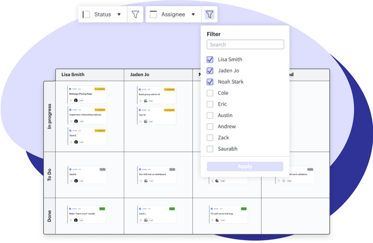 Scrollen Sie nicht mehr durch lange Aufgabenlisten. Importieren Sie Tickets aus Jira, um Cards auf Ihrem Board neu anzuordnen, zu sammeln sowie zu sortieren und Ihre Arbeit visuell zu planen.