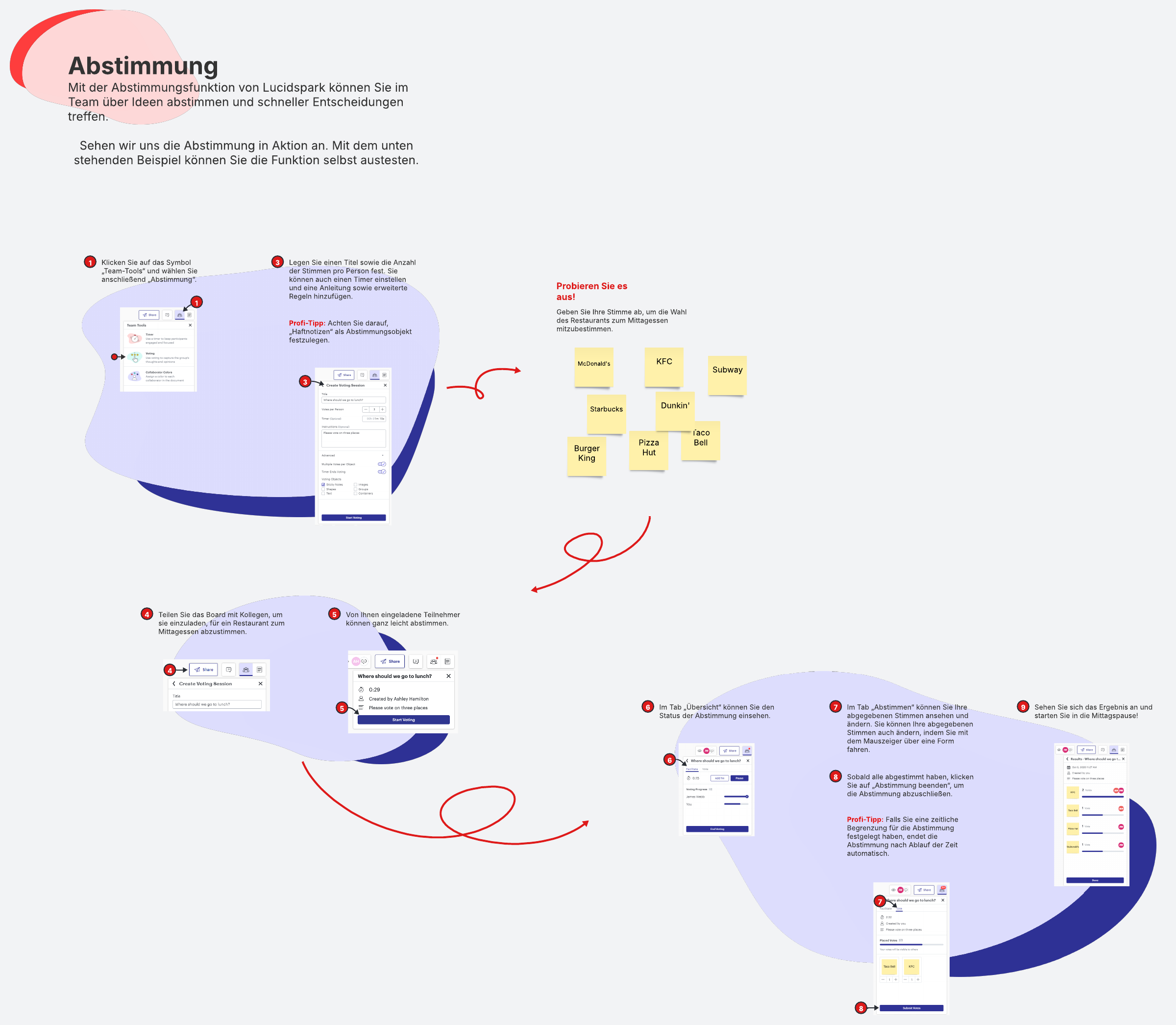 Einfach über Ideen abstimmen, die Ergebnisse visualisieren und Ideen nach der Anzahl der Stimmen gruppieren. Diese Vorlage bietet ein Tutorial zu der Abstimmungsfunktion in Lucidspark.