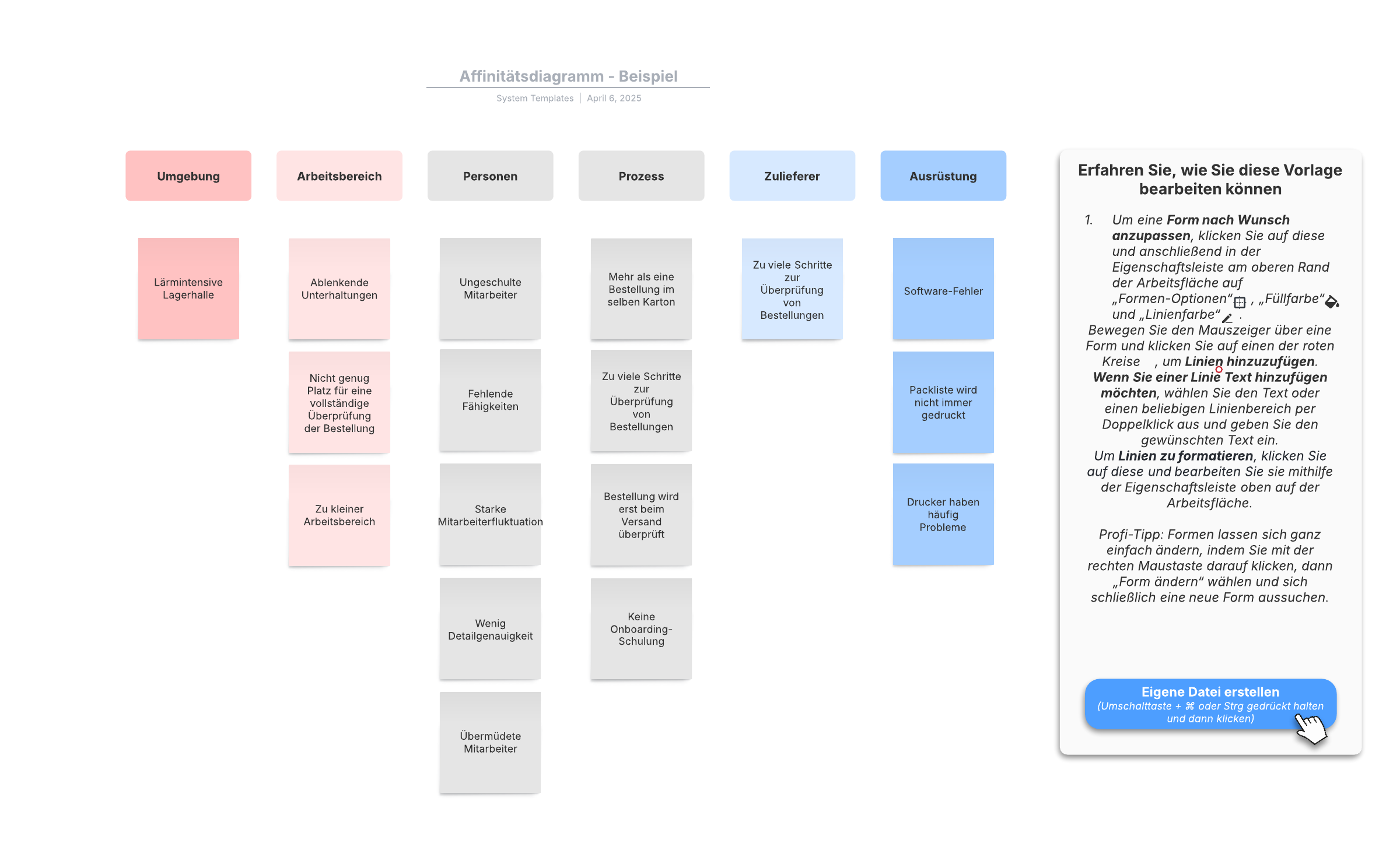Öffnen Sie diese Vorlage, um ein detailliertes Beispiel für ein Affinitätsdiagramm einzusehen, das Sie an Ihren Anwendungsfall anpassen können.