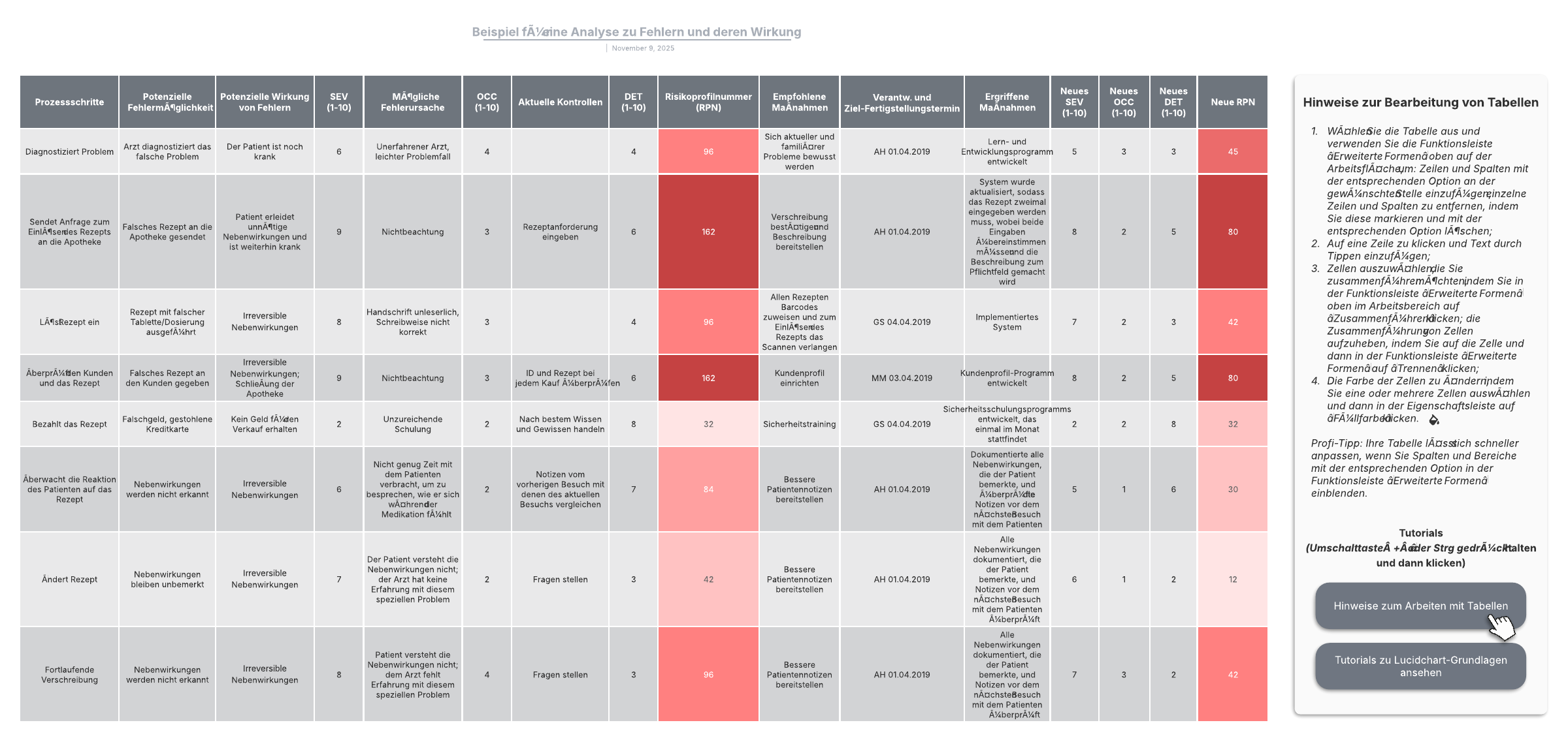 Öffnen Sie diese Vorlage und sehen Sie sich ein detailliertes Beispiel für eine Analyse zu Fehlermöglichkeiten und deren Wirkung an, das Sie an Ihren Anwendungsfall anpassen können.
