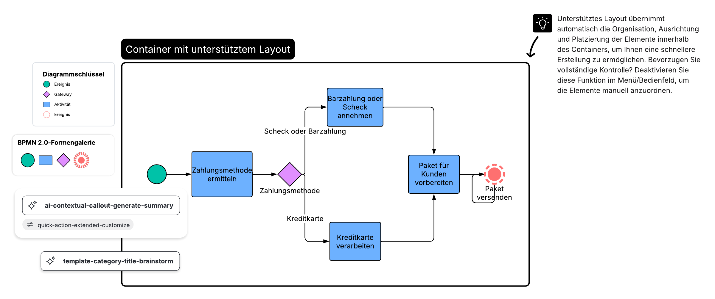 Öffnen Sie diese Vorlage, um ein detailliertes Beispiel für ein BPMN-2.0-Diagramm anzeigen zu lassen, das Sie an Ihren Anwendungsfall anpassen können.
