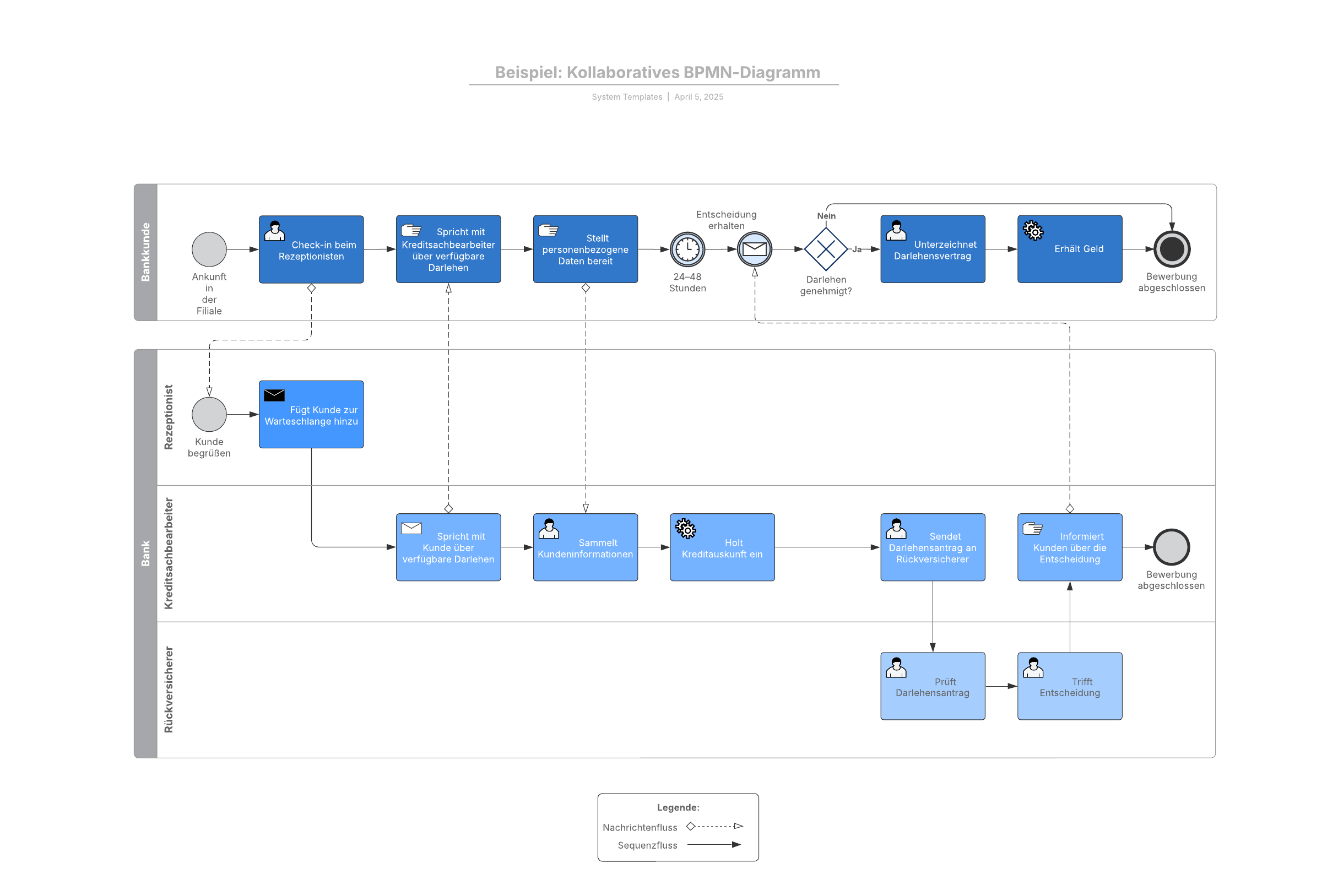 Dieses kollaborative Diagramm nutzt die Business Process Modeling Notation (BPMN), um den Geschäftsprozess und die Kommunikation zwischen zwei oder mehreren Entitäten darzustellen. Konkret zeigt diese Vorlage den Prozess zur Beantragung eines Darlehens.