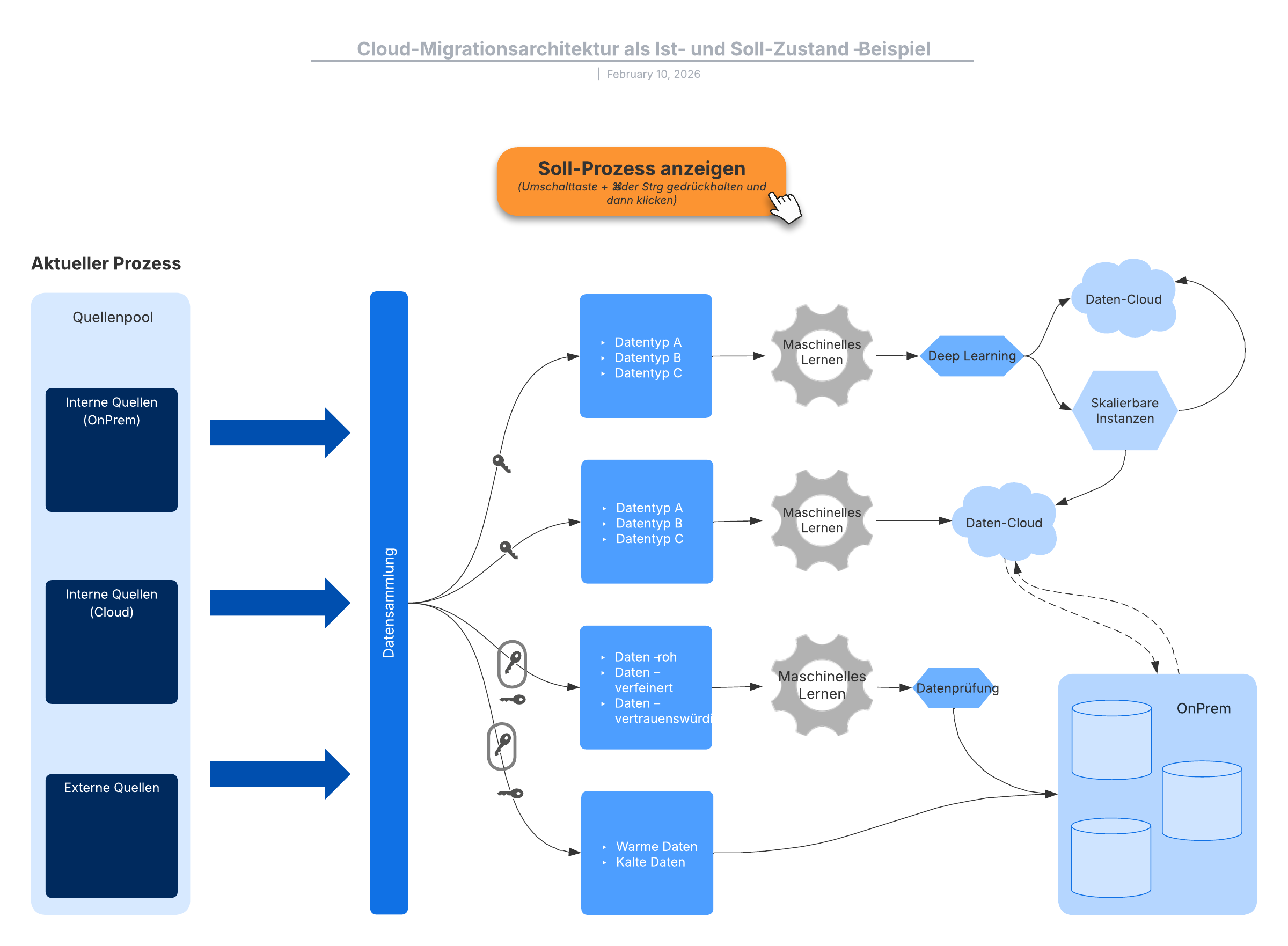 Öffnen Sie diese Vorlage für Cloud-Migration-Architekturen als Ist- und Soll-Zustand und fügen Sie Inhalte hinzu, um sie an Ihren Anwendungsfall anzupassen.