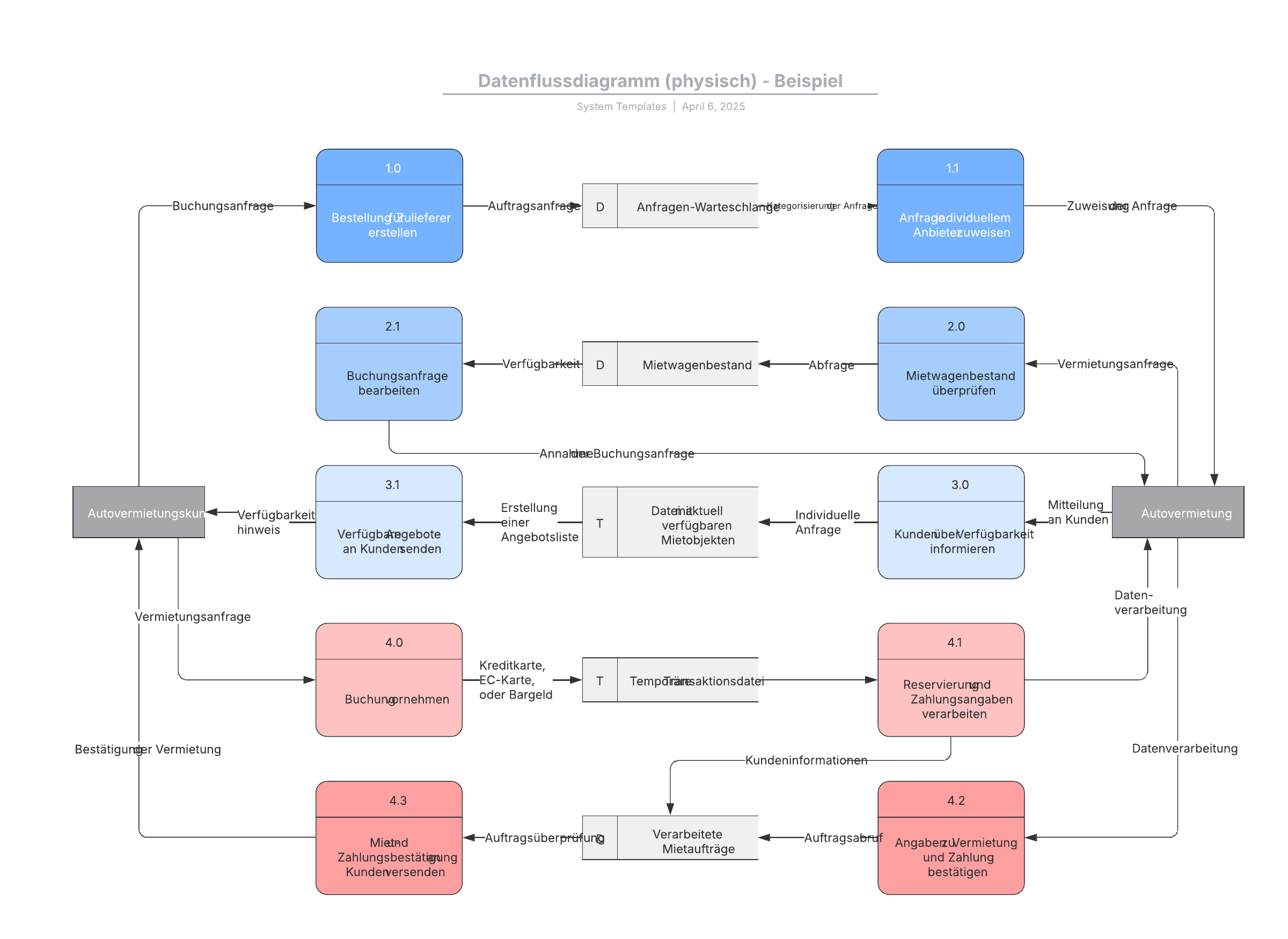 Durch Öffnen dieser Vorlage wird ein detailliertes Beispiel für ein physisches Datenflussdiagramm angezeigt, das Sie an Ihren Anwendungsfall anpassen können.