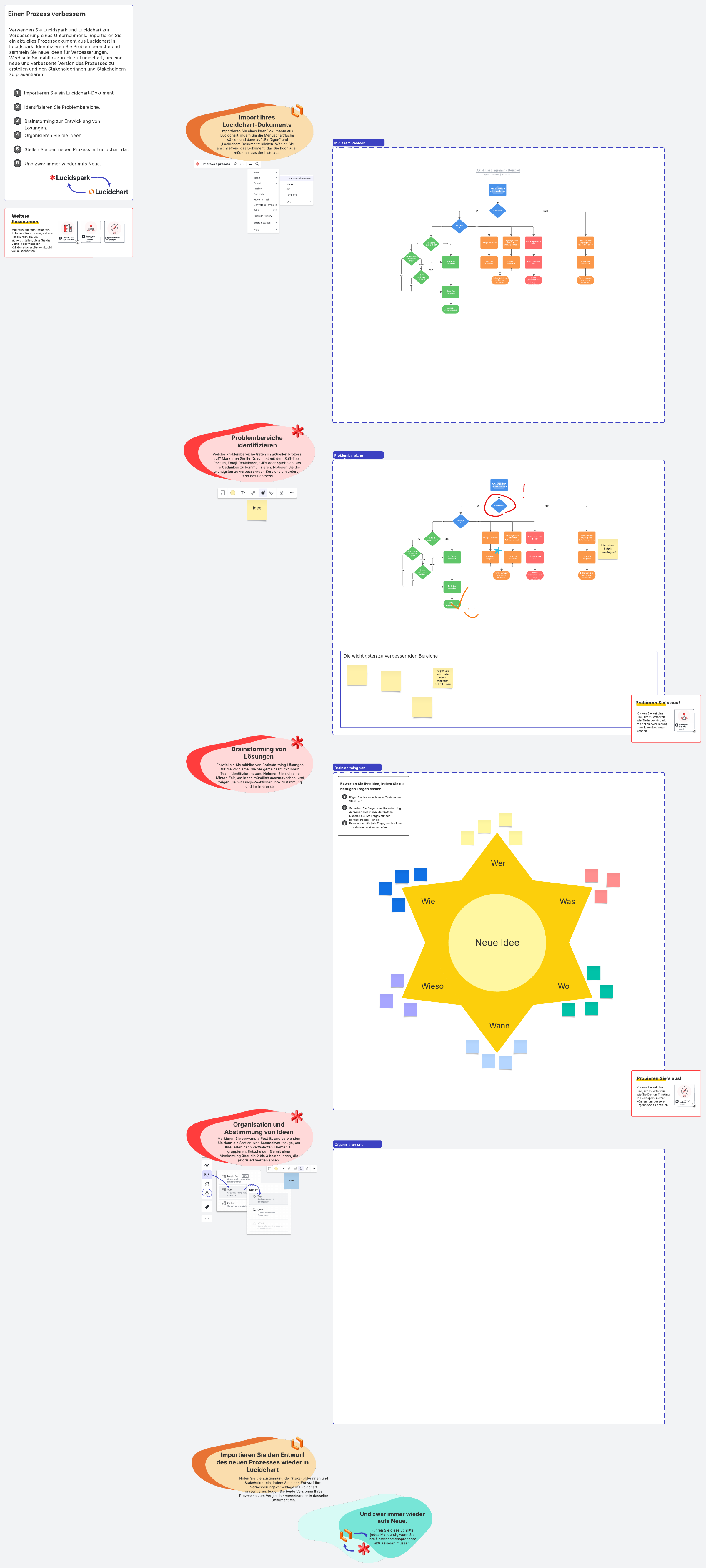Verwenden Sie die Lucid Suite (Lucidspark und Lucidchart), um einen bestehenden Prozess zu verbessern. Importieren Sie zunächst einen aktuellen von Ihnen erstellten Prozessfluss aus Lucidchart. Identifizieren Sie dann Problembereiche und entwickeln Sie mithilfe von Brainstorming Ideen für Verbesserungen in Lucidspark. Wechseln Sie nahtlos zurück zu Lucidchart, um eine neue und verbesserte Version des Prozesses zu erstellen und den Stakeholderinnen und Stakeholdern zu präsentieren.