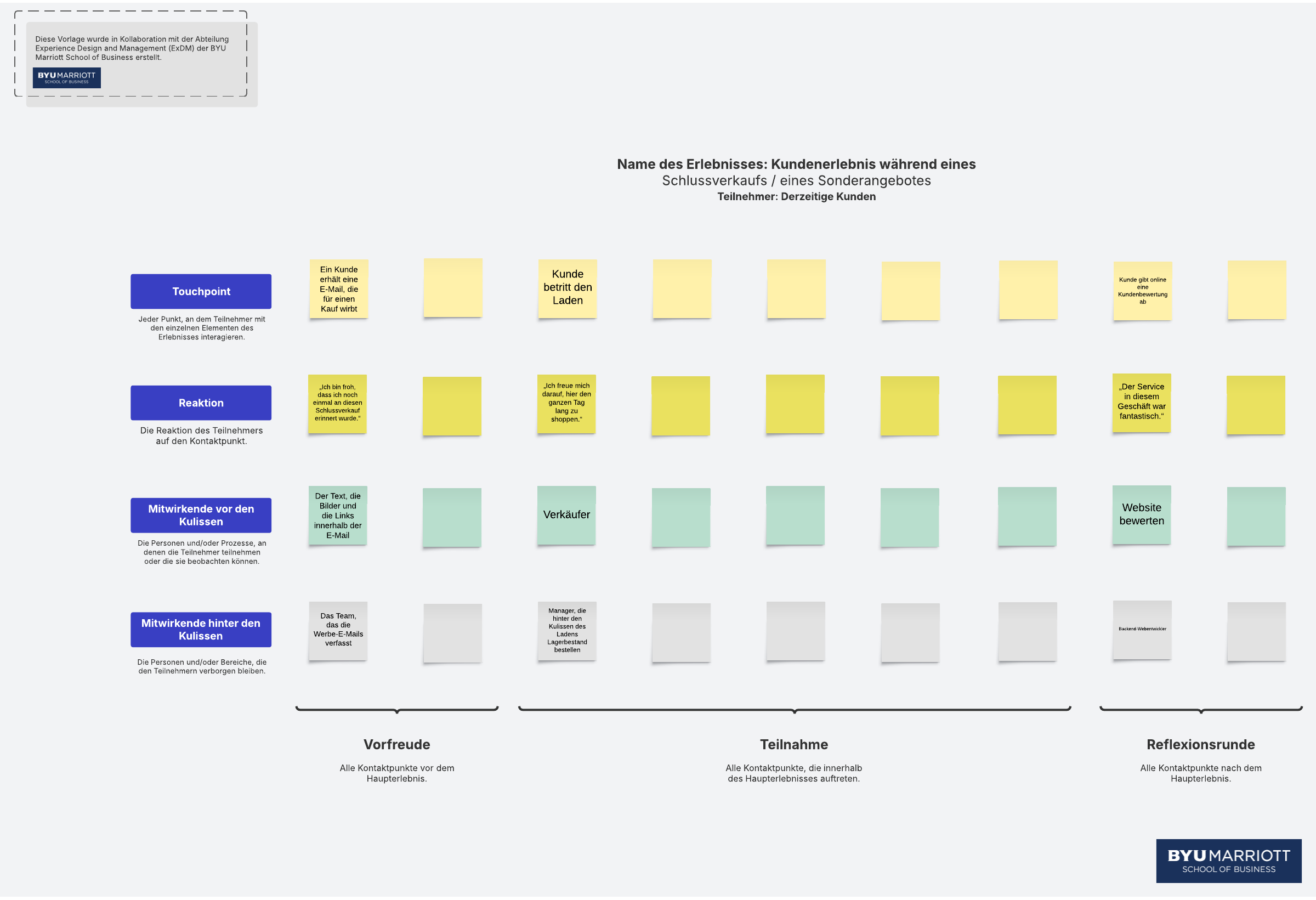 Diese Erlebnis-Map wird Sie dabei unterstützen, für Ihre Benutzer oder Verbraucher individuelle Erlebnisse zu gestalten.  Beziehen Sie sowohl die Mitarbeiter vor als auch die hinter den Kulissen in die Gestaltung der Kontaktpunkte zwischen den Benutzern und dem Erlebnis ein.