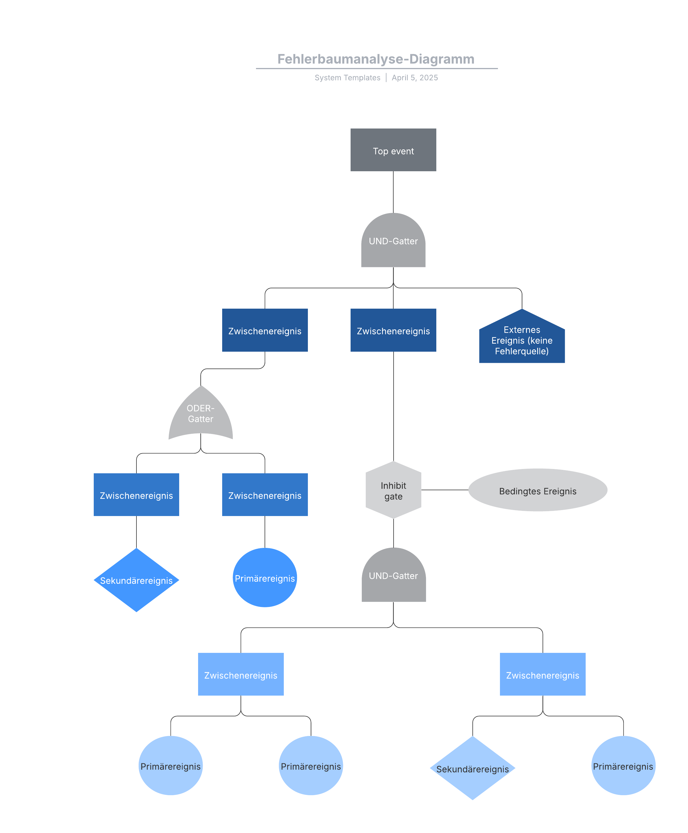 Öffnen Sie diese Vorlage und fügen Sie Inhalte hinzu, um dieses Fehlerbaumanalyse-Diagramm an Ihren Anwendungsfall anzupassen.