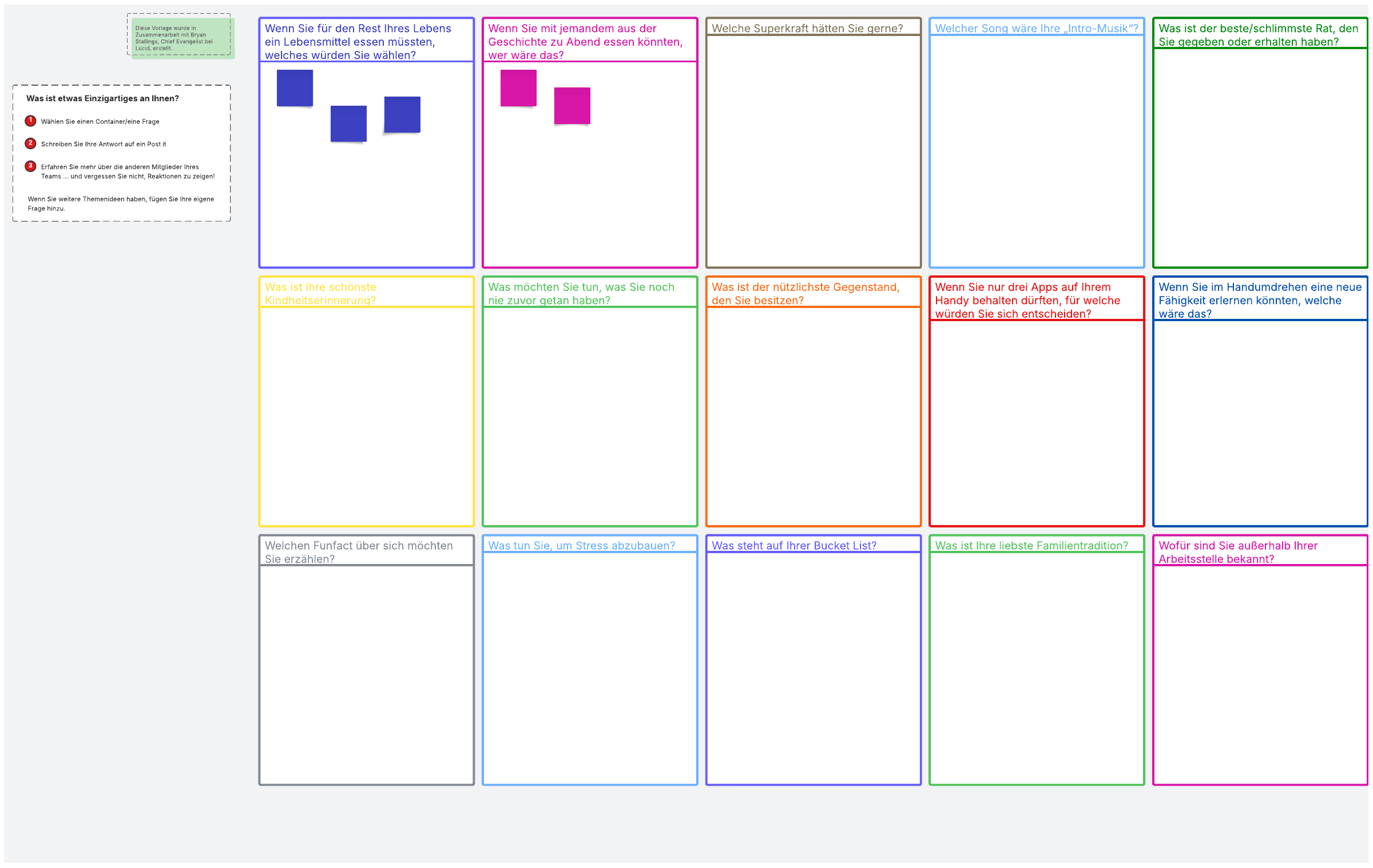 Verwenden Sie diesen Icebreaker zum Kennenlernen zu Beginn eines Remote-Meetings, um den Teilnehmenden dabei zu helfen, sich zu entspannen, sich mit ihren Kollegen und Kolleginnen wohl zu fühlen und Spaß zu haben.
