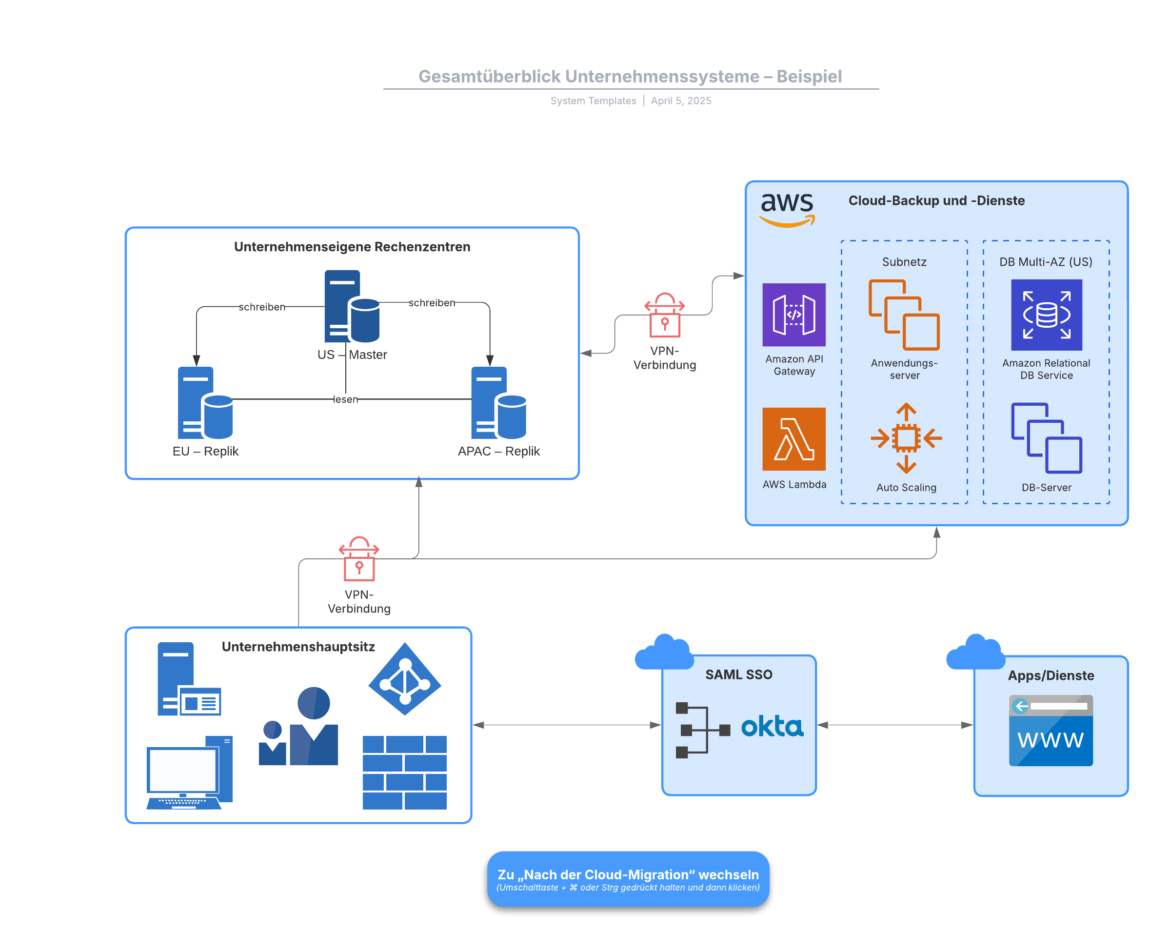 Durch Öffnen dieser Vorlage wird ein Beispiel für einen Gesamtüberblick über Unternehmenssysteme angezeigt, das Sie an Ihren Anwendungsfall anpassen können.