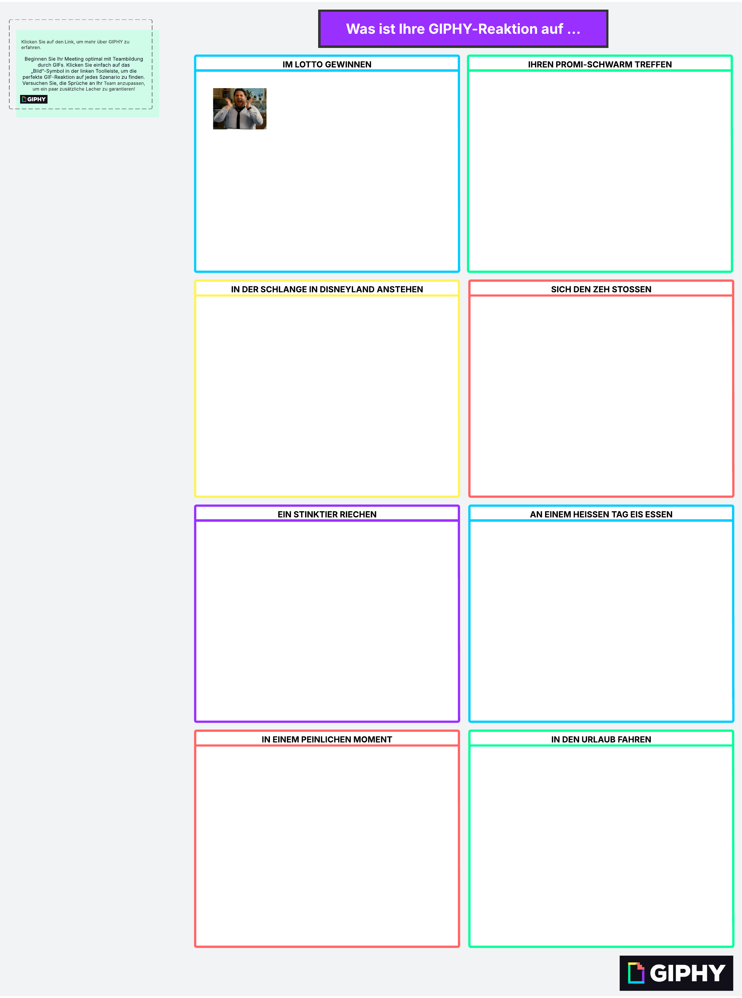 Beginnen Sie Ihr Meeting optimal mit Teambildung durch GIFs. Klicken Sie einfach auf das „Bild“-Symbol in der linken Toolleiste, um die perfekte GIF-Reaktion auf jedes Szenario zu finden. Versuchen Sie, die Sprüche an Ihr Team anzupassen, um ein paar zusätzliche Lacher zu garantieren!