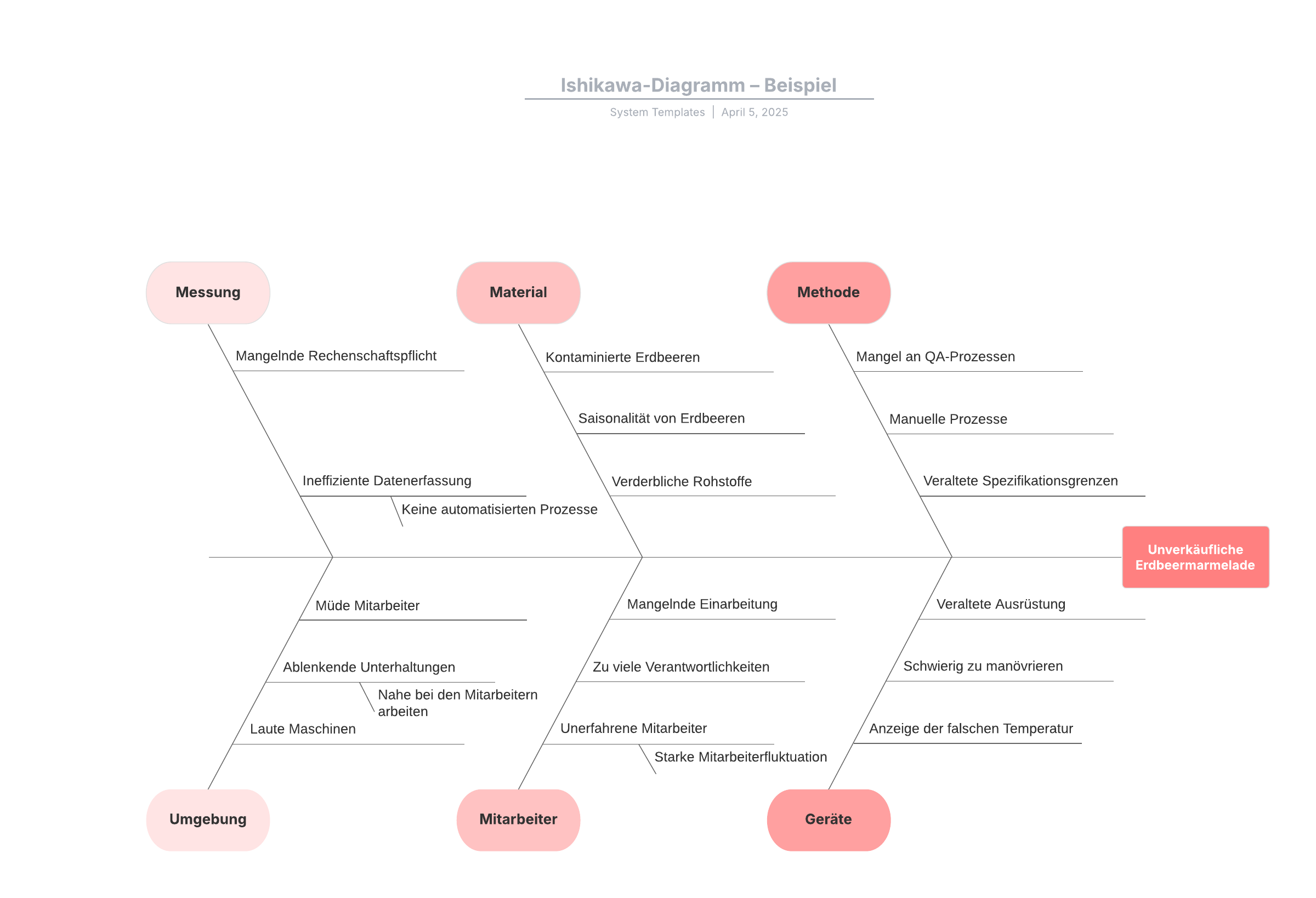 Öffnen Sie diese Vorlage, um ein detailliertes Beispiel für ein Ishikawa-Diagramm anzeigen zu lassen, das Sie an Ihren Anwendungsfall anpassen können.