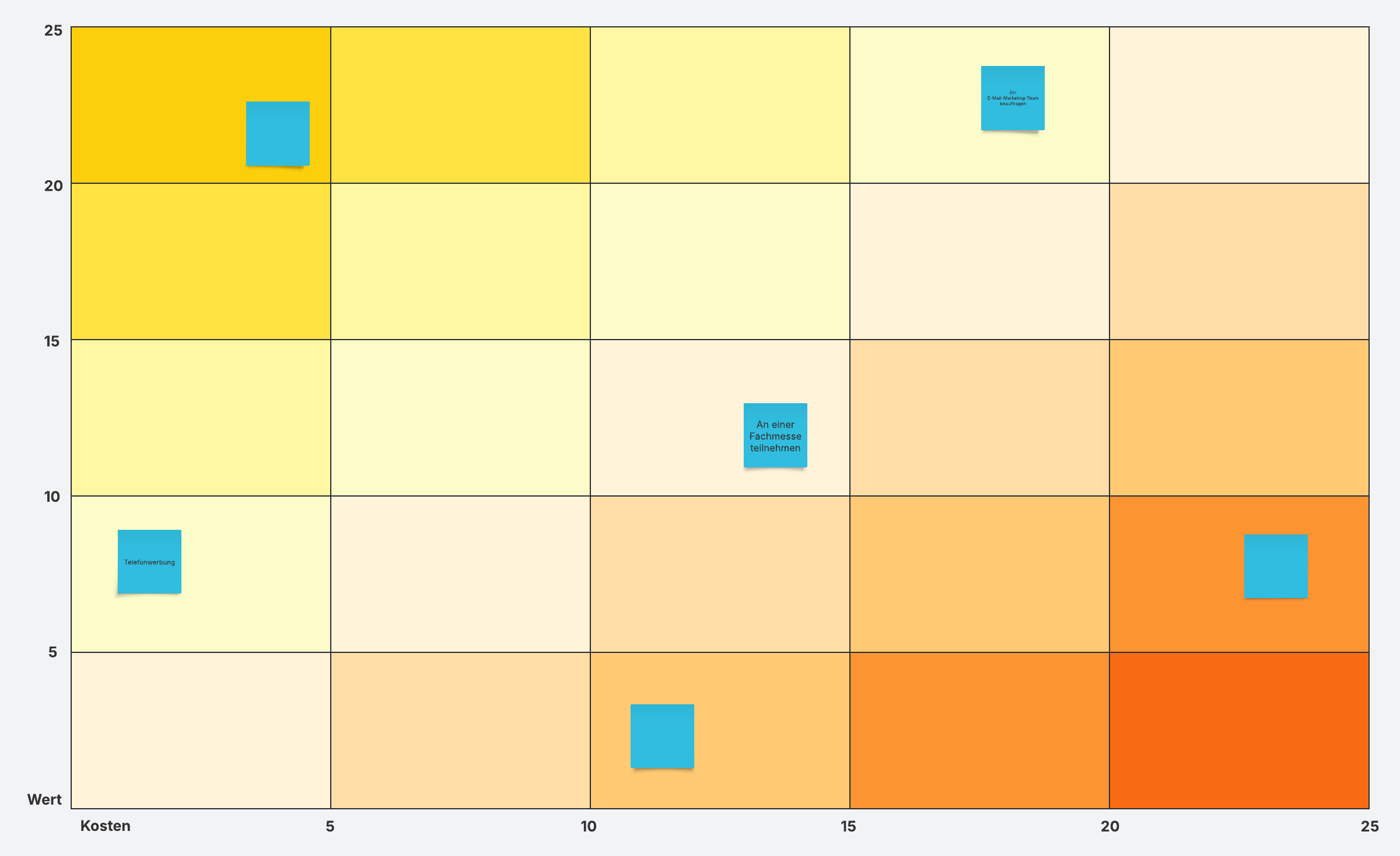 Evaluieren und Priorisieren Sie Aufgaben, Projekte und Initiativen mittels einer Kosten-Nutzen-Analyse. Nutzen Sie diese „Mehr fürs Geld“-Vorlage alleine oder gemeinsam als Team, um sicherzustellen, dass all Ihre Projekte und Aufgaben den besten Nutzen für entstehende Kosten aufweisen.