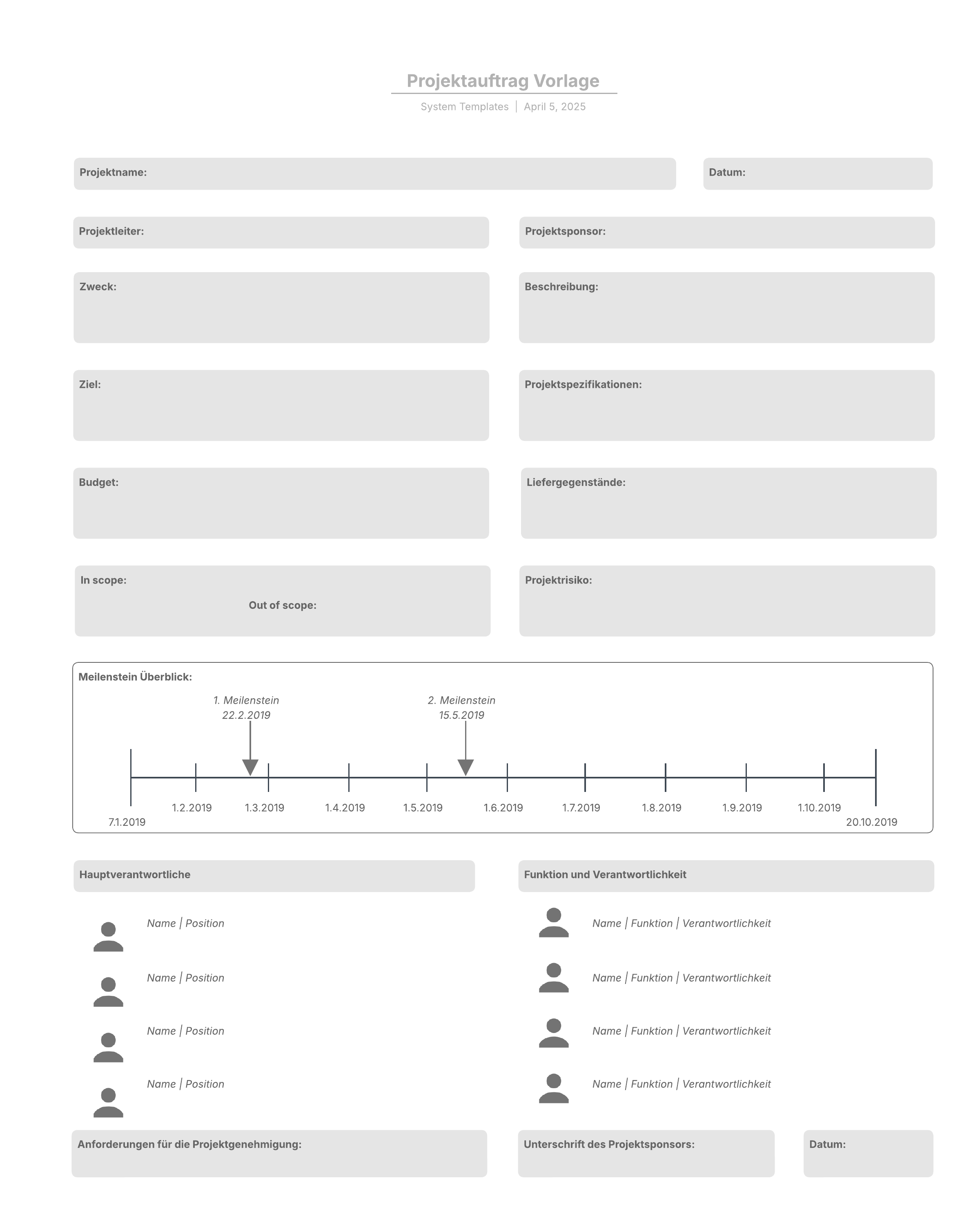 Nutzen Sie diese Vorlage, um Ihren eigenen Projektauftrag zu erstellen und dokumentieren Sie Meilensteine und deren Status, sowie Hauptverantwortliche des Projekts.