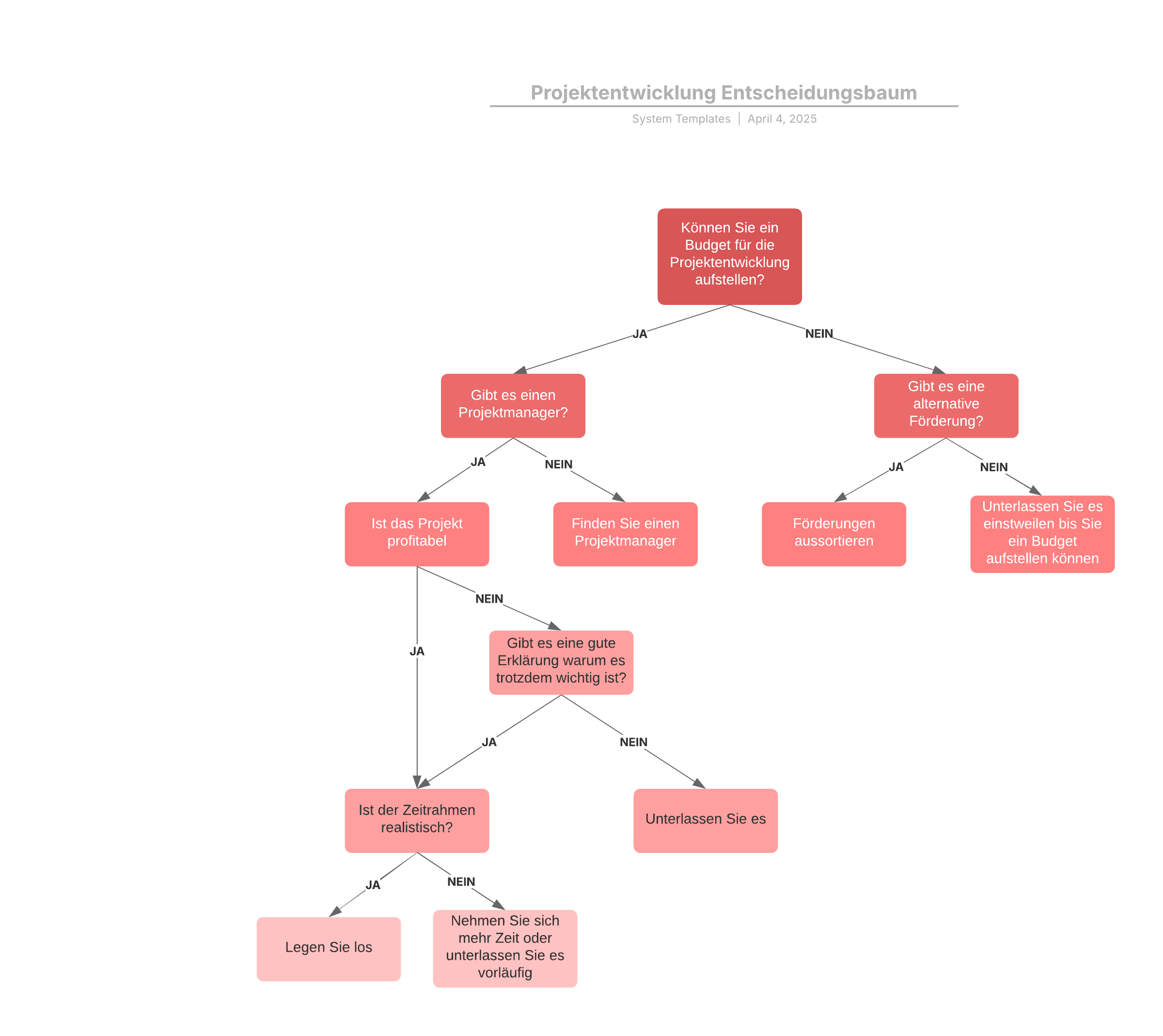 Dieser Entscheidungsbaum stellt den möglichen Ausgang einer neuen Projektentwicklung dar und hilft Ihnen zu entscheiden, ob sich Ihr Investment in ein neues Projekt auszahlt.