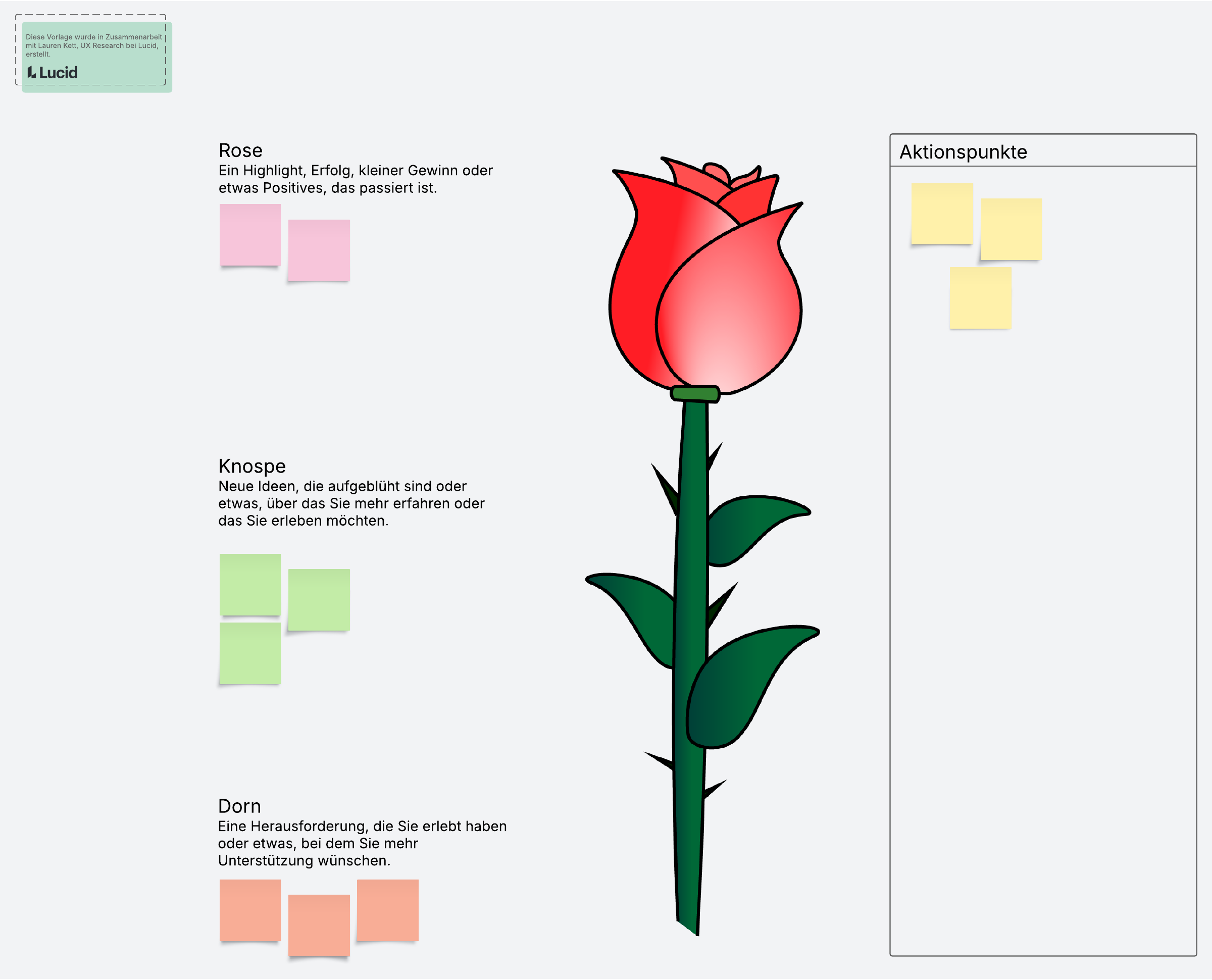Nutzen Sie diese Retrospektive, um Highlights, neue Ideen und Herausforderungen für Ihr aktuelles Projekt zu ermitteln.