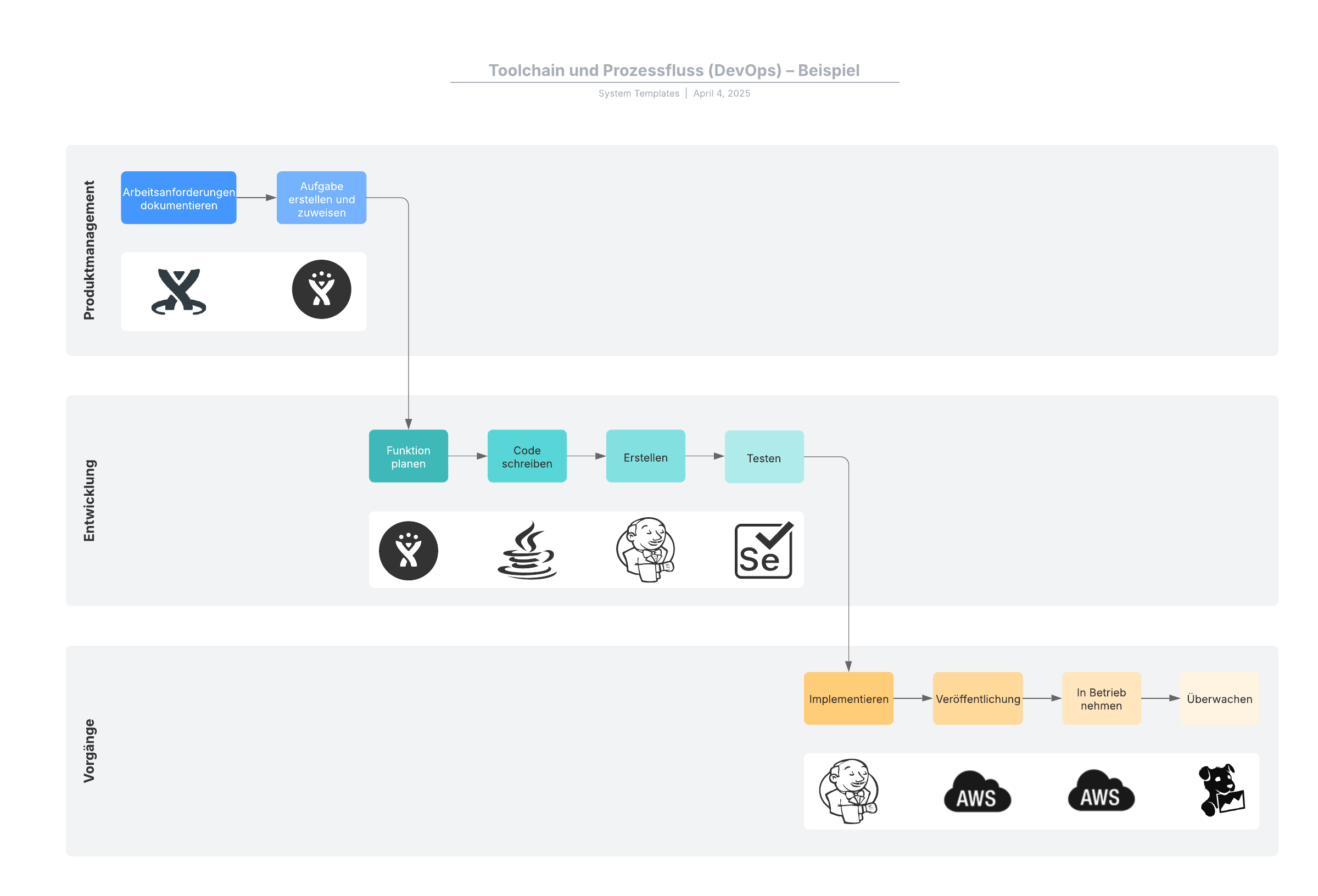 Durch Öffnen dieser Vorlage wird ein detailliertes Beispiel für eine Überblicksdarstellung von Toolchain und Prozessfluss (DevOps) angezeigt, das Sie an Ihren Anwendungsfall anpassen können.