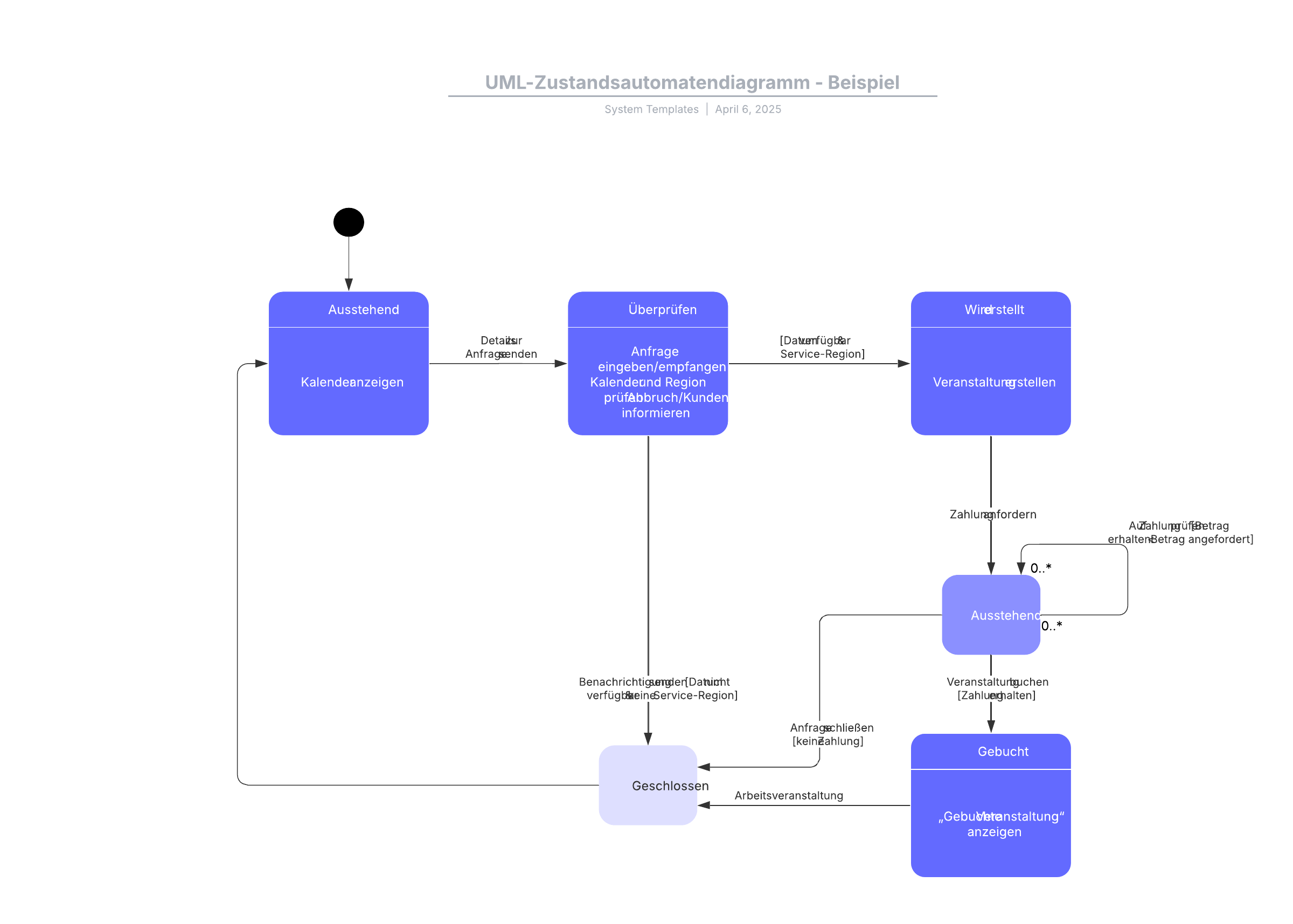 Durch Öffnen dieser Vorlage wird ein detailliertes Beispiel für ein UML-Zustandsautomatendiagramm angezeigt, das Sie an Ihren Anwendungsfall anpassen können.