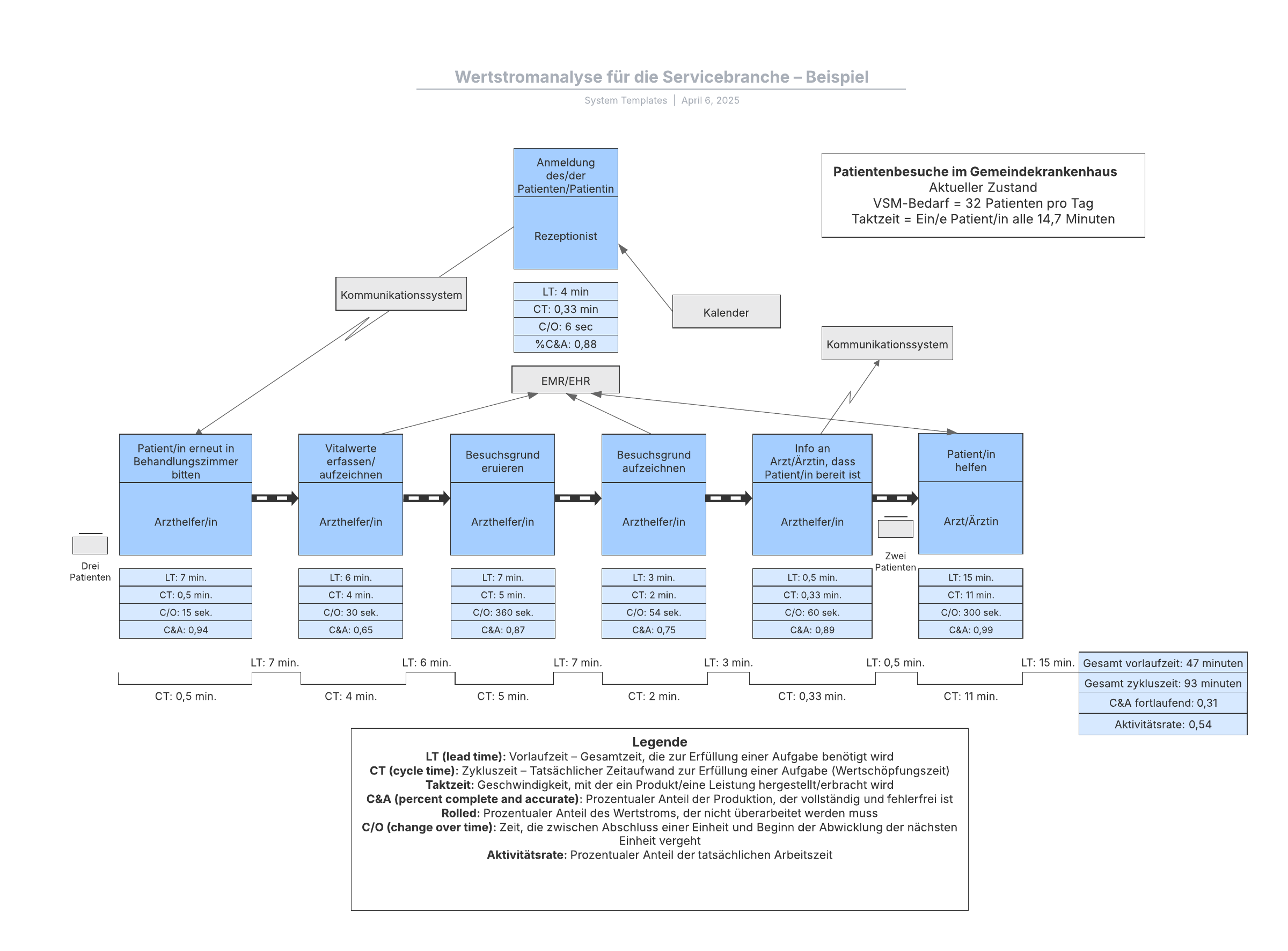 Durch Öffnen dieser Vorlage wird ein detailliertes Beispiel für eine Wertstromanalyse (Servicebranche) angezeigt, das Sie an Ihren Anwendungsfall anpassen können.