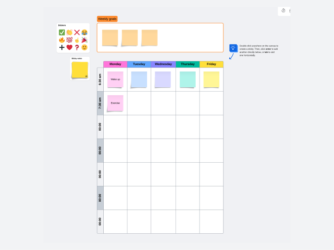 Las plantillas personalizables de Lucidspark eliminan las conjeturas a la hora de crear tu agenda semanal. Ofrecemos muchas plantillas que se adaptan a diferentes estilos y tipos de planificación. Crea listas de tareas diarias u el horario de clases, luego personaliza tu combinación de colores, agrega texto y más según tus necesidades.
