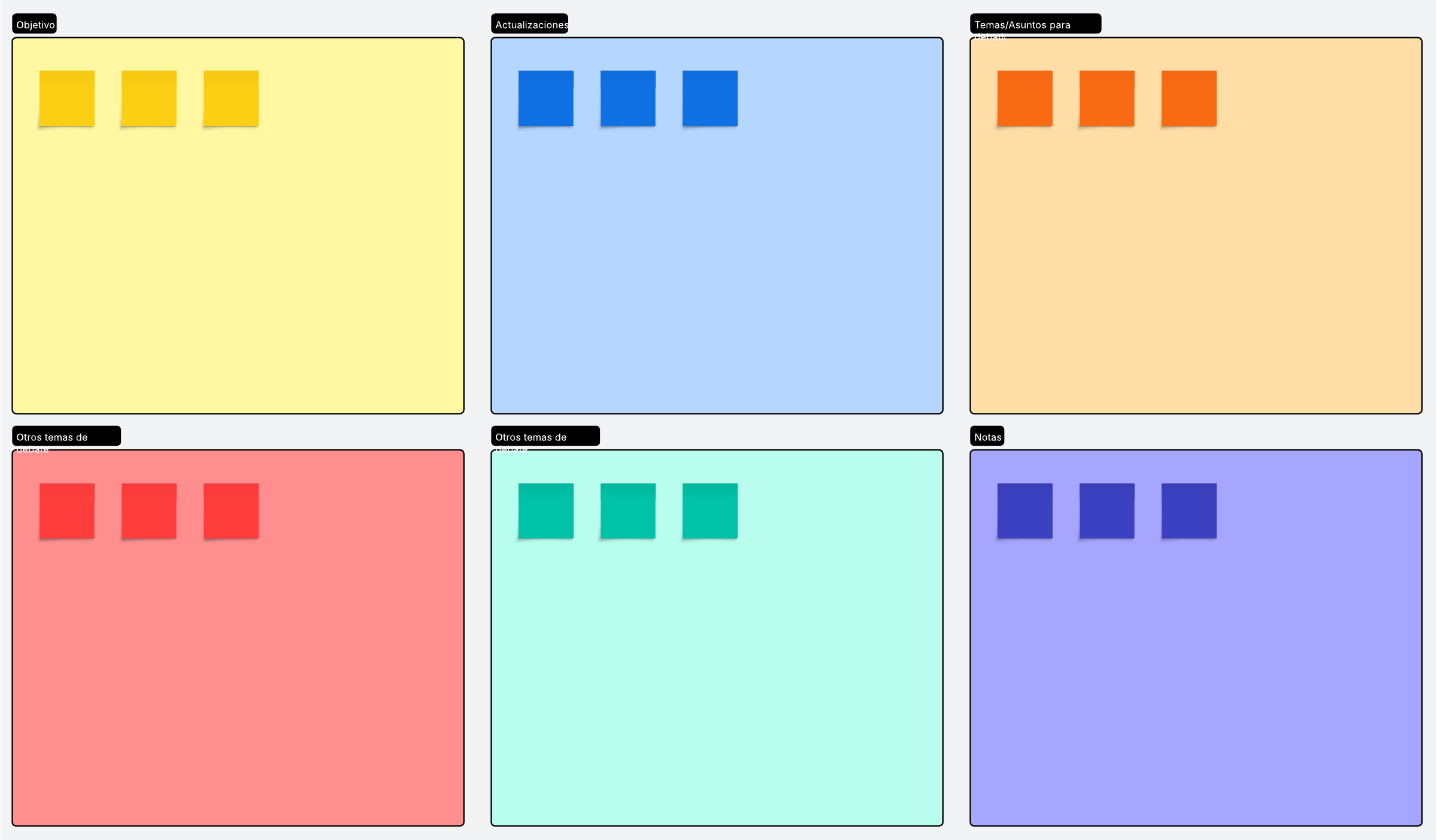 Esta agenda para reuniones de trabajo o de equipo permitirá que tu equipo se mantenga enfocado y les dará a los asistentes un adelanto sobre qué esperar. Documenta los objetivos de la reunión, las actualizaciones y los temas de debate. Además, hay un lugar para crear elementos de acción y tomar notas durante la reunión.