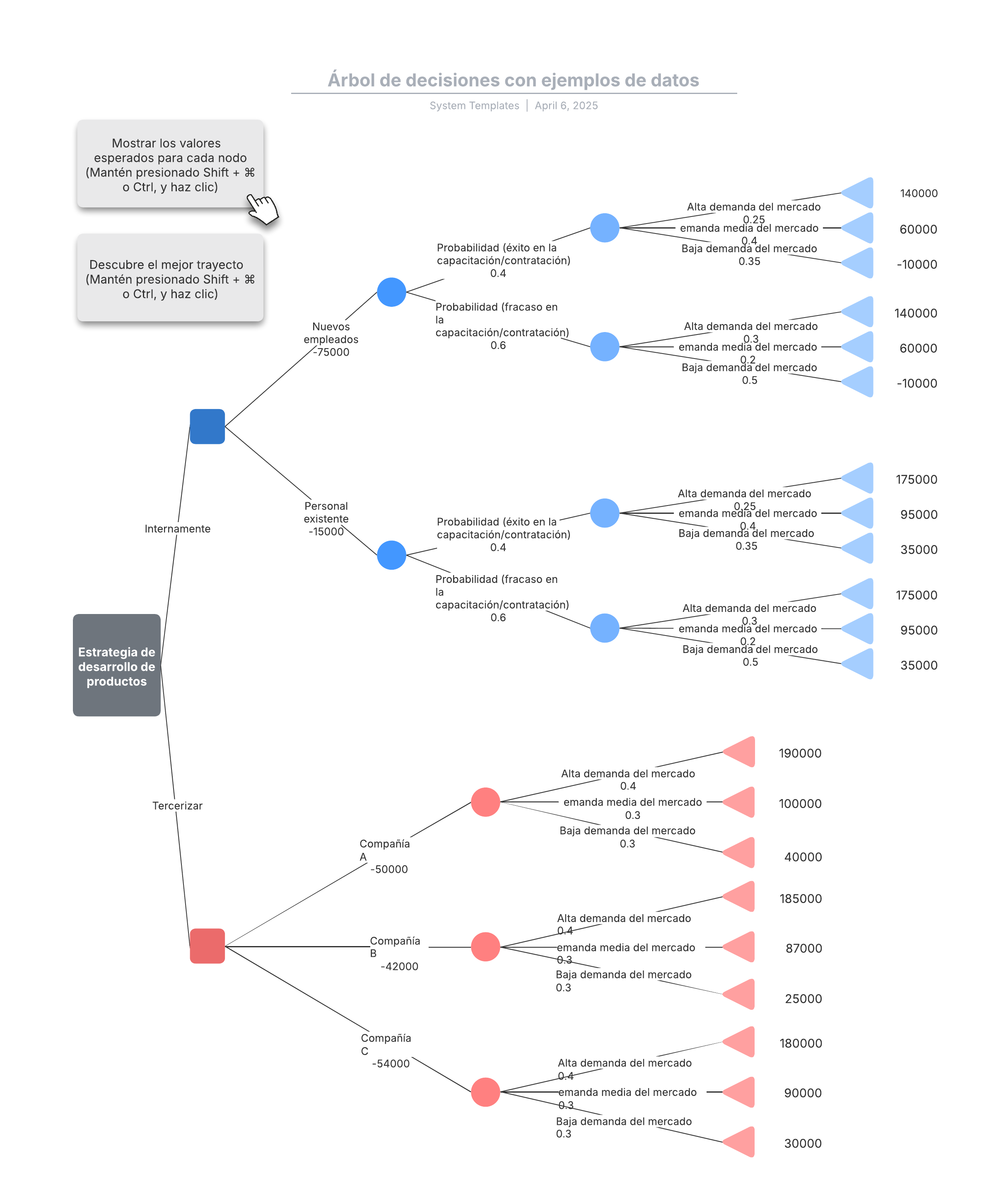 Abre esta plantilla para ver un ejemplo detallado de un árbol de decisiones con datos que puedes personalizar según tu caso de uso.