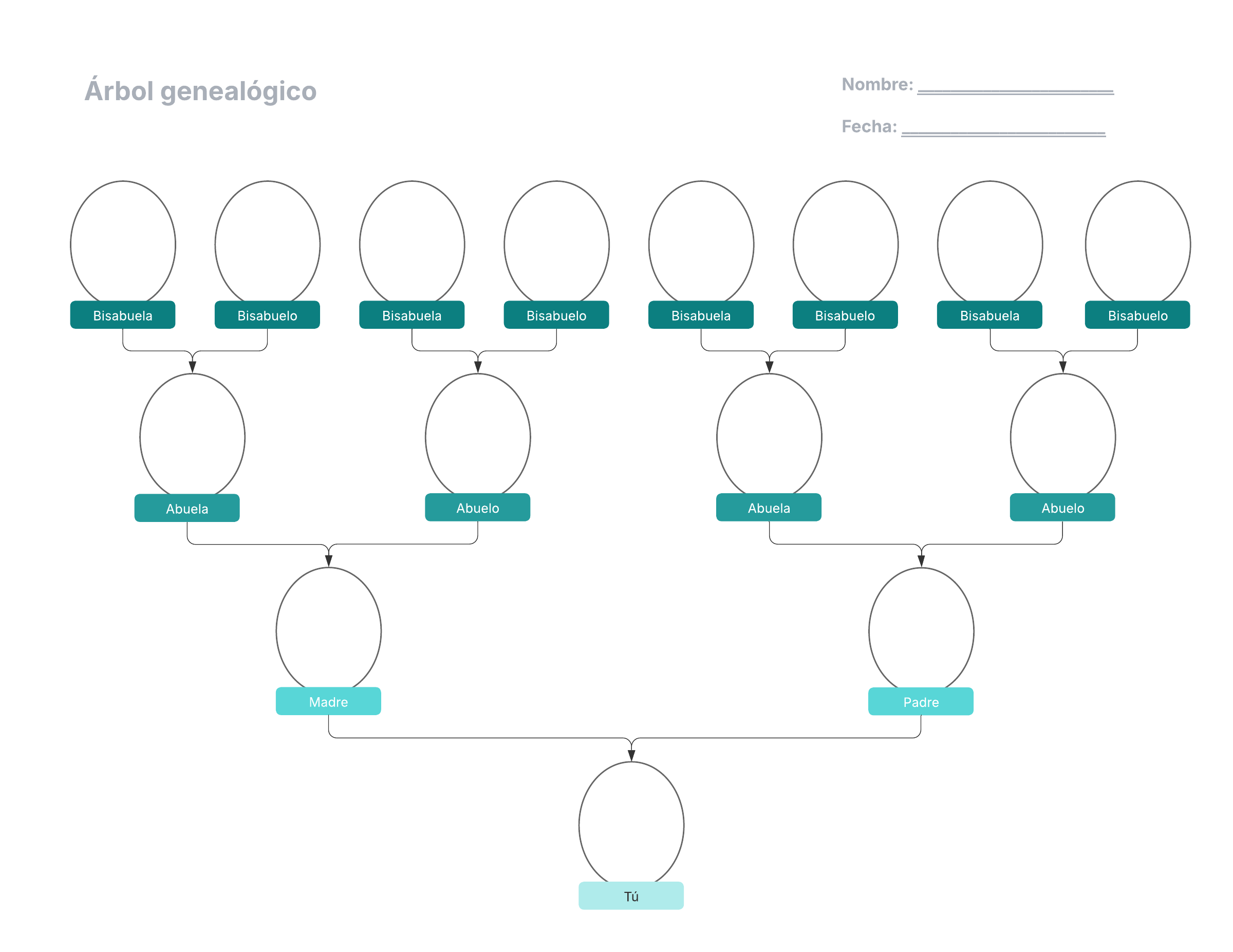 Abre esta plantilla y añade contenido para personalizar este diagrama de árbol genealógico según tu caso de uso.