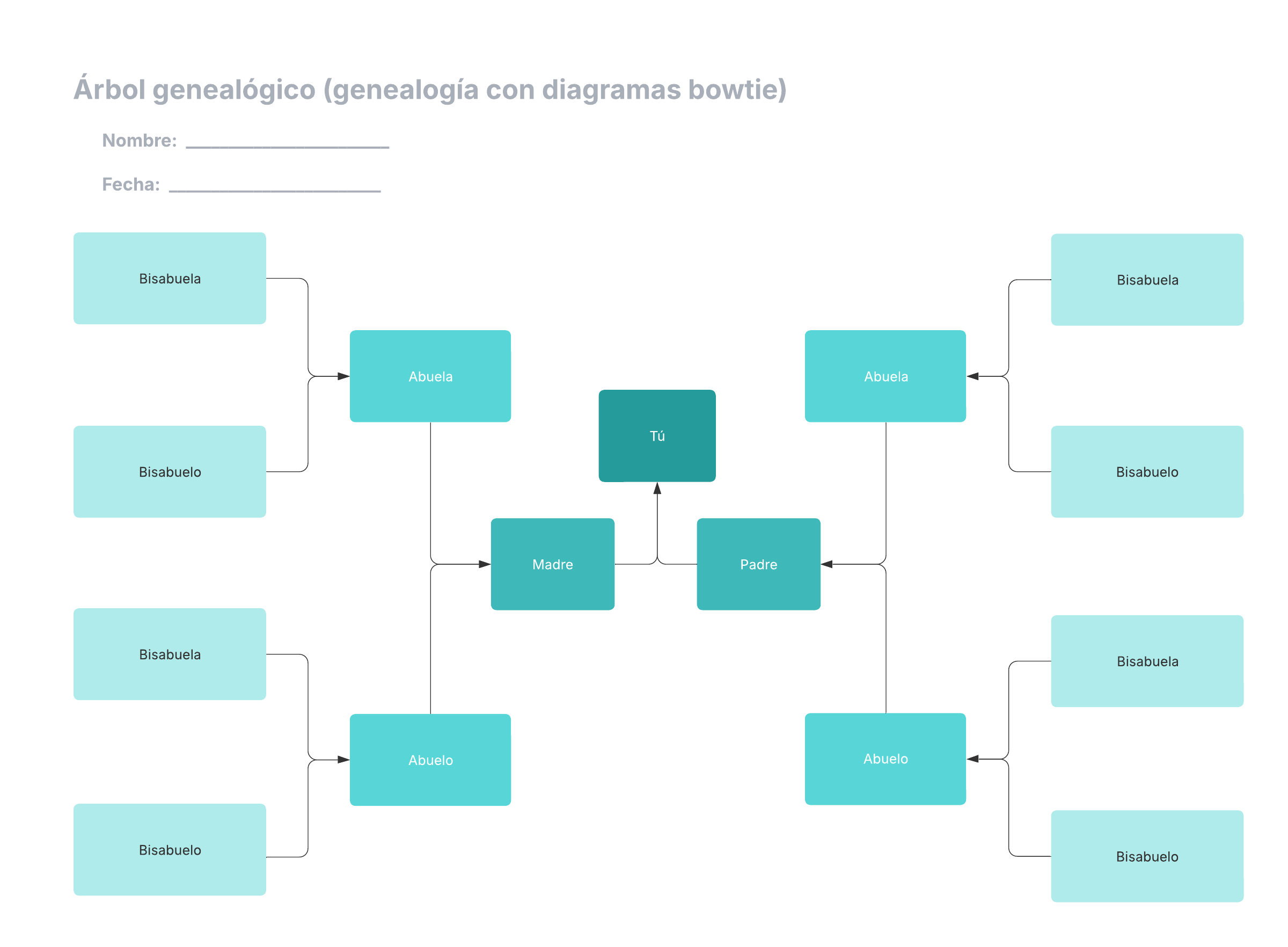 Abre esta plantilla y añade contenido para personalizar este árbol genealógico (genealogía con diagramas bowtie) según tu caso de uso.