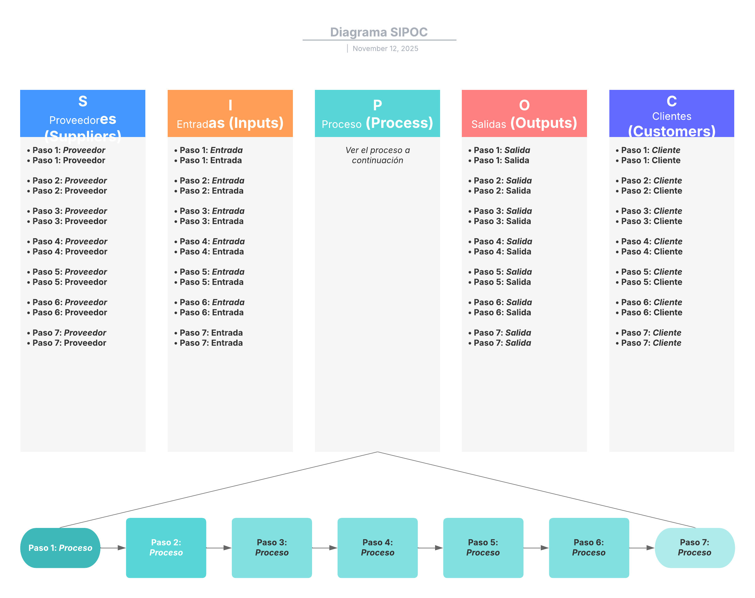 Abre esta plantilla y añade contenido para personalizar este diagrama SIPOC básico según tu caso de uso.