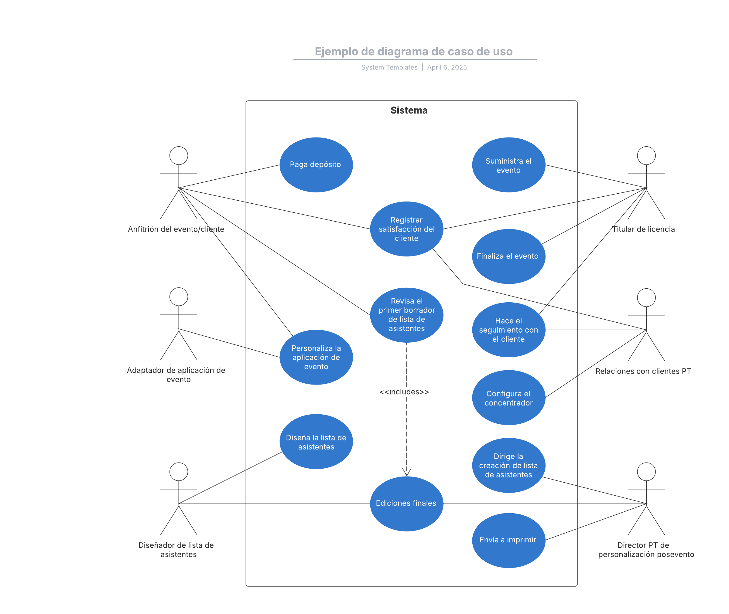 Abre esta plantilla para ver un ejemplo detallado de un diagrama básico de caso de uso que puedes personalizar según tu caso de uso.