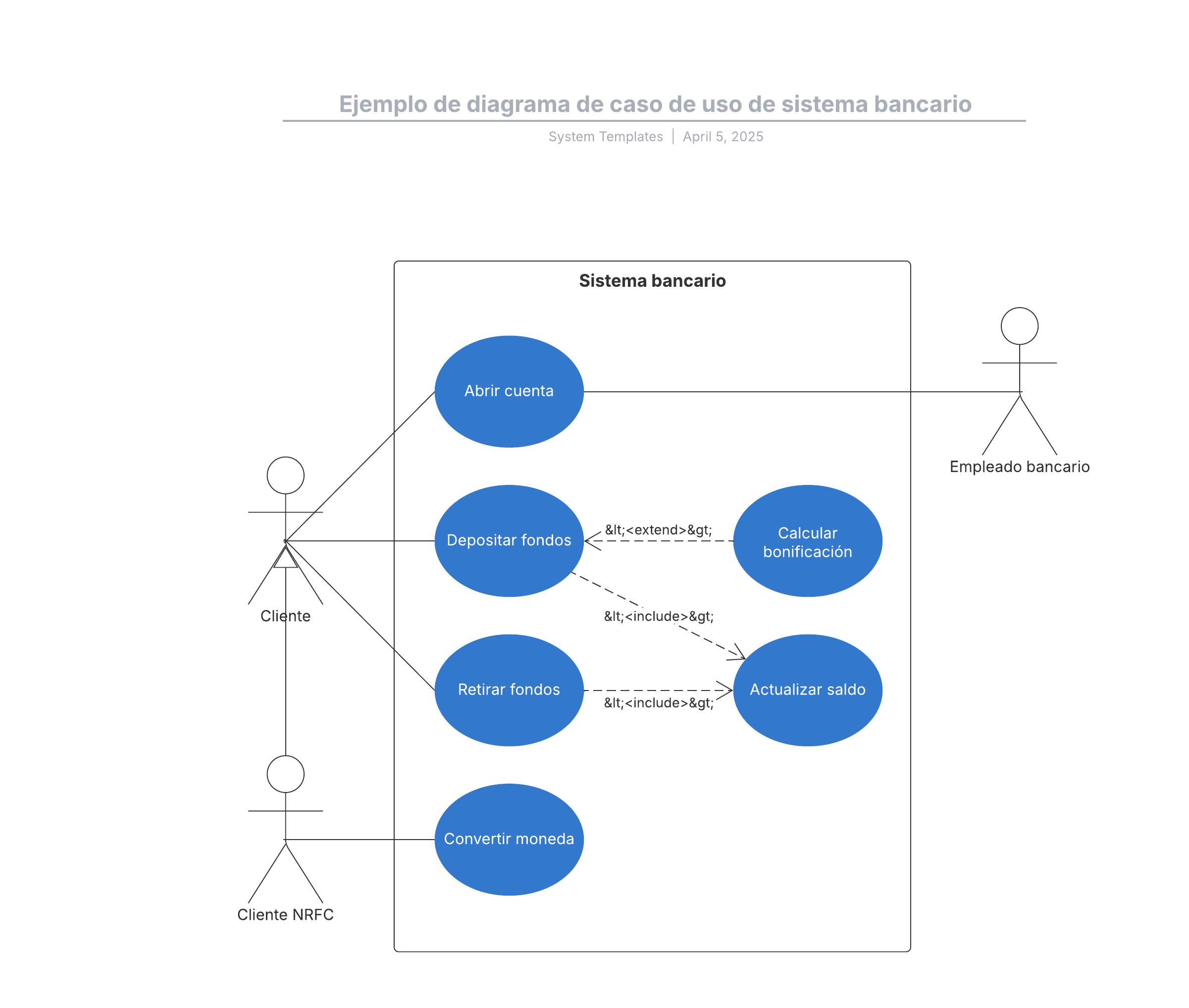 Abre esta plantilla para ver un ejemplo detallado de un diagrama de caso de uso de sistema bancario que puedes personalizar según tu caso de uso.