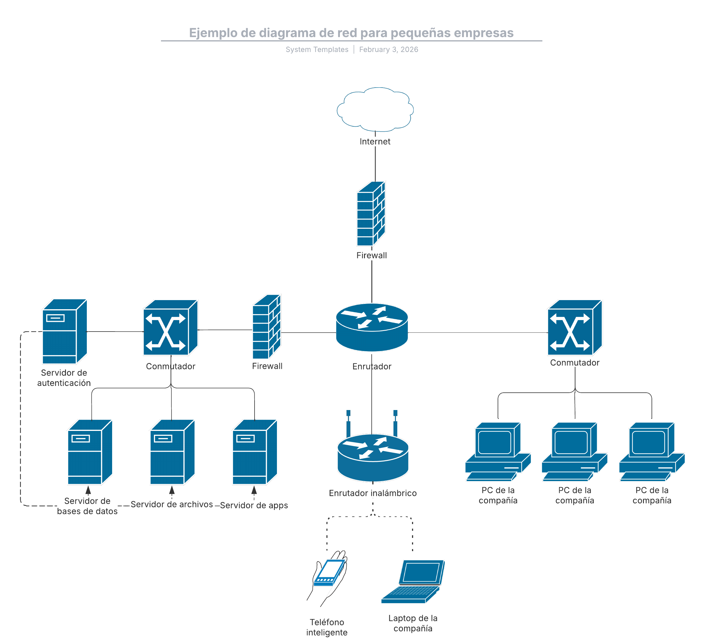 Abre esta plantilla para ver un ejemplo de un diagrama de red para pequeñas empresas que puedes personalizar según tu caso de uso.