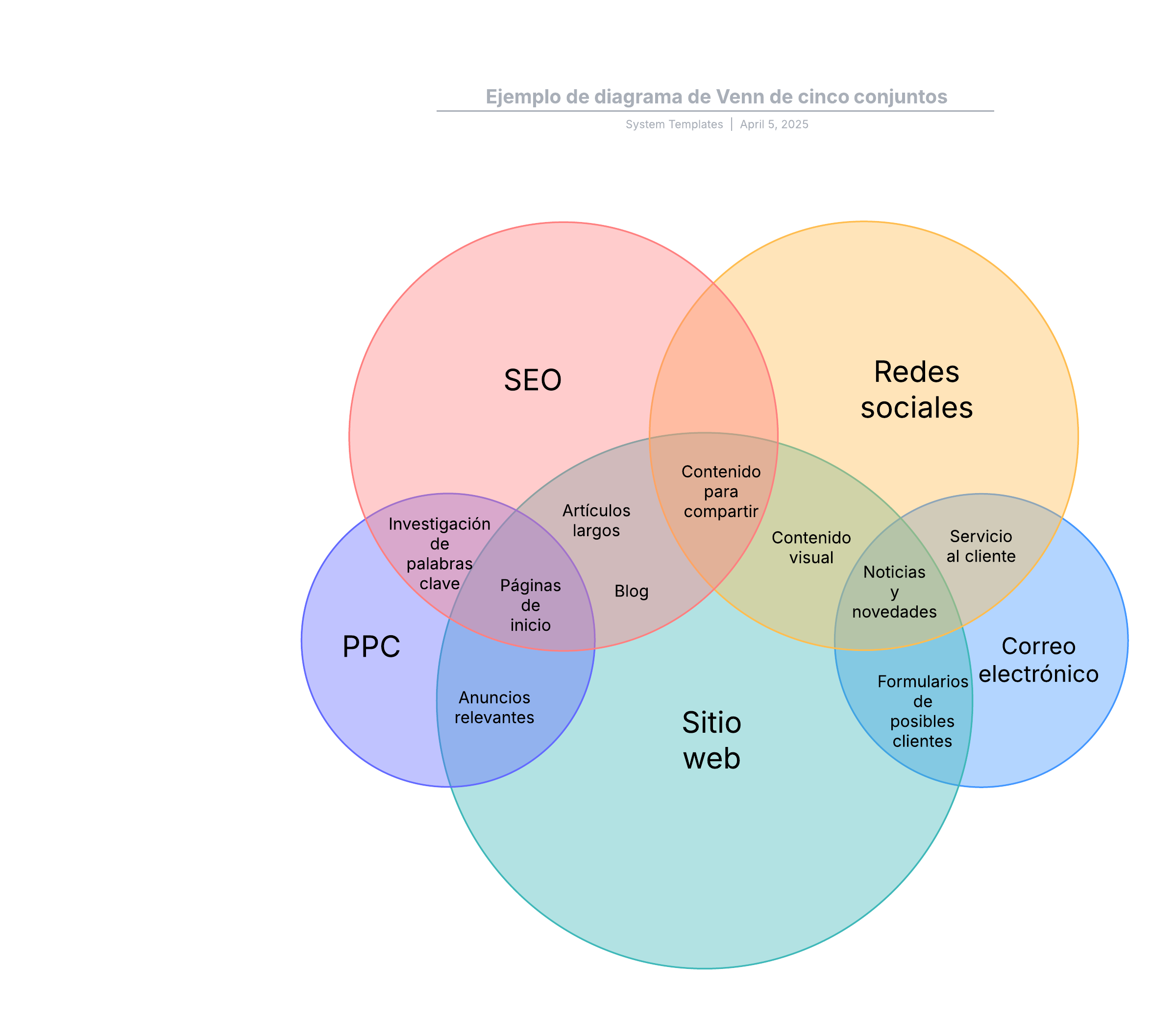 Abre esta plantilla para ver un ejemplo detallado de un diagrama de Venn de cinco conjuntos que puedes personalizar según tu caso de uso.