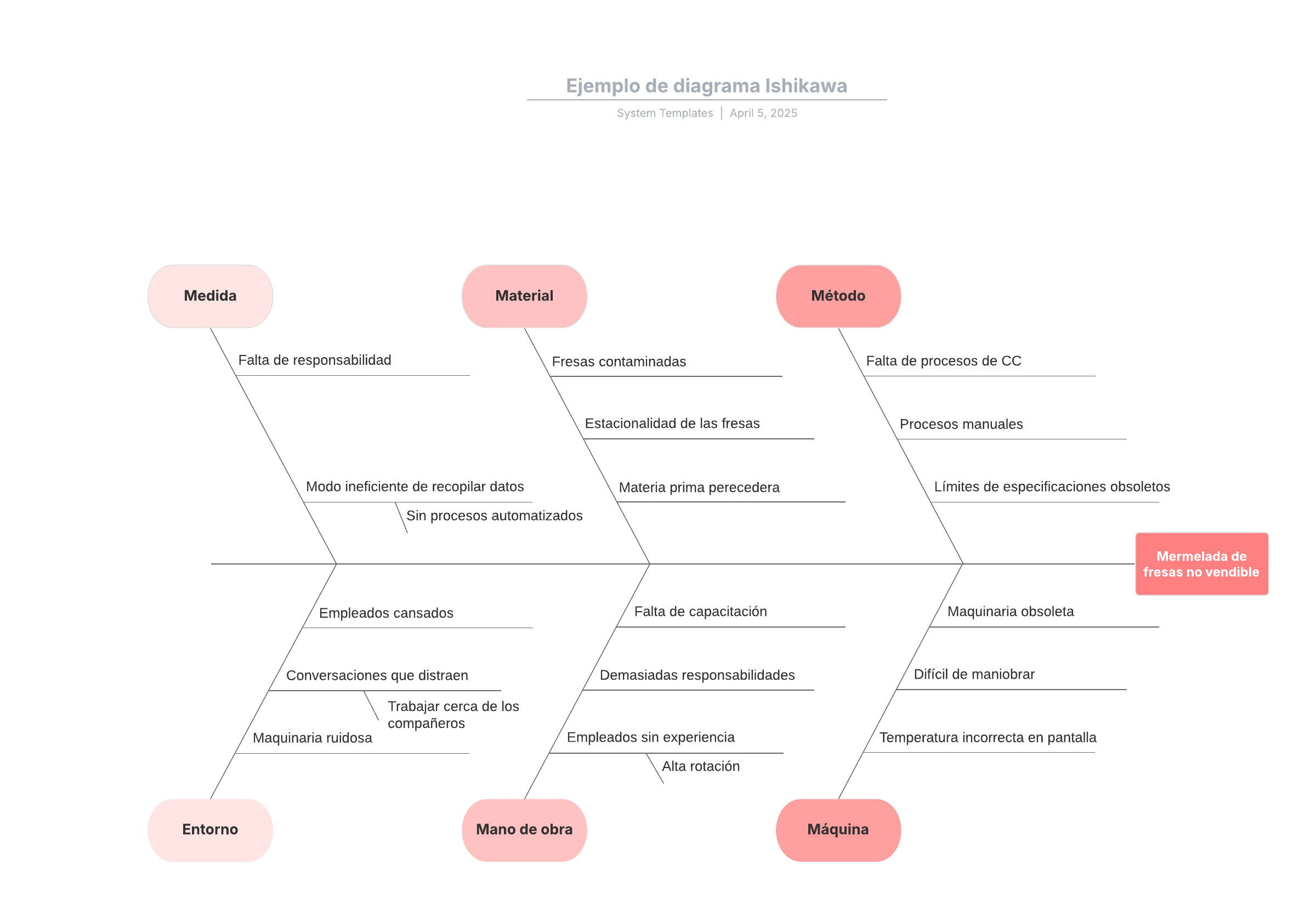 Abre esta plantilla para ver un ejemplo detallado de un diagrama Ishikawa que puedes personalizar según tu caso de uso.