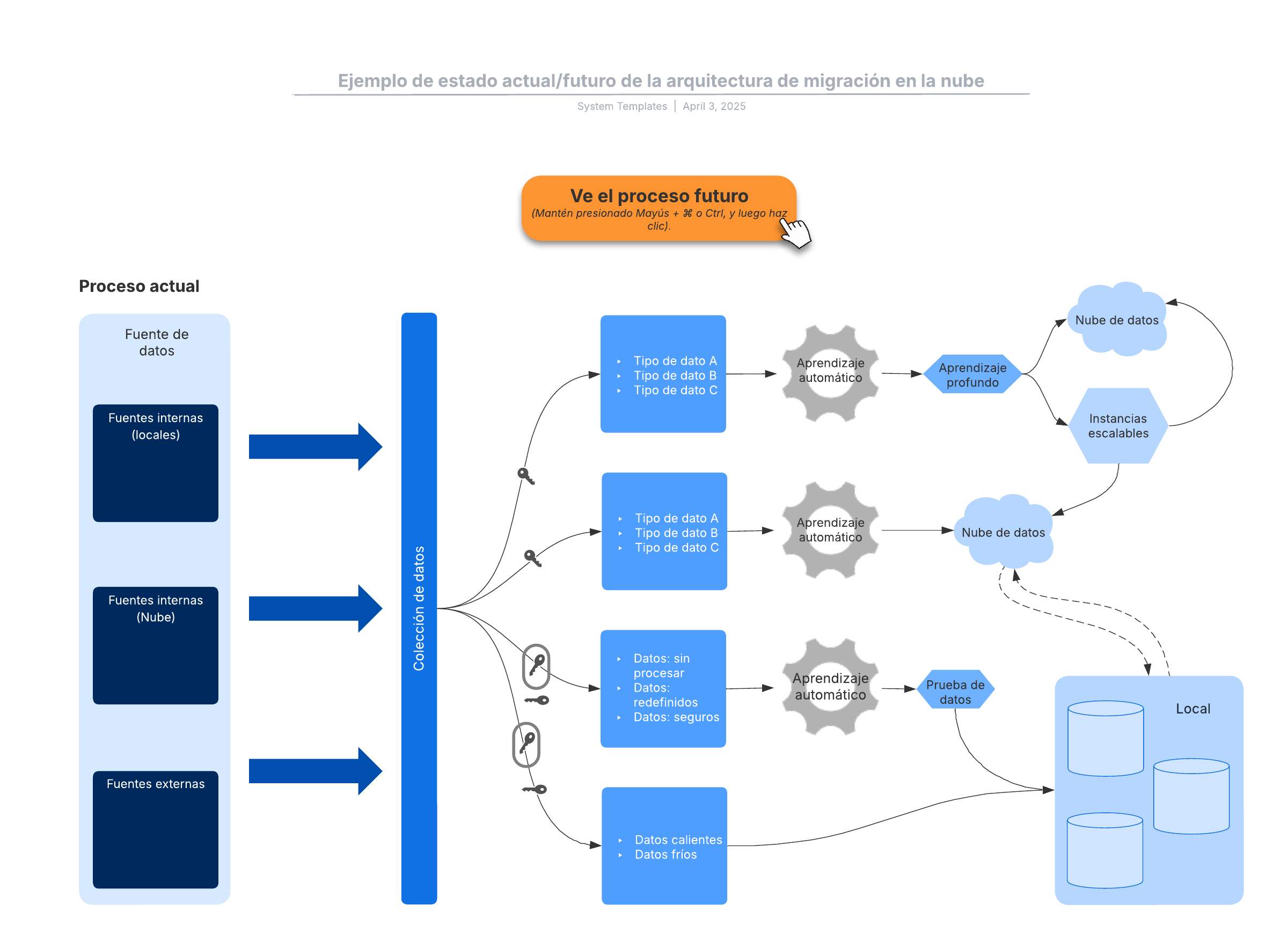 Abre esta plantilla y añade contenidos para personalizar este diagrama de estado actual/futuro de arquitectura de la migración a la nube según tu caso de uso.