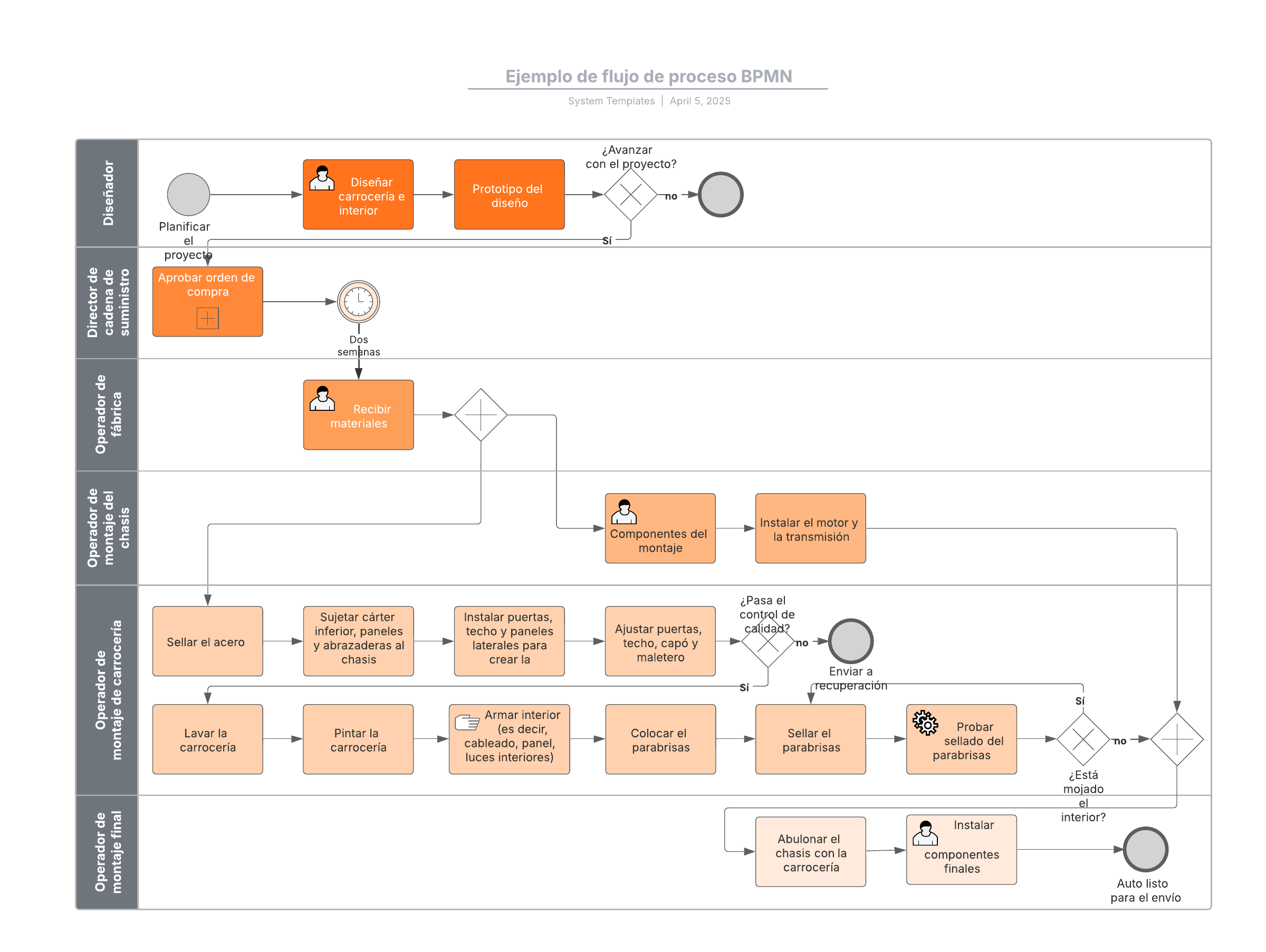 Abre esta plantilla para ver un ejemplo detallado de un diagrama de flujo de proceso BPMN que puedes personalizar según tu caso de uso.