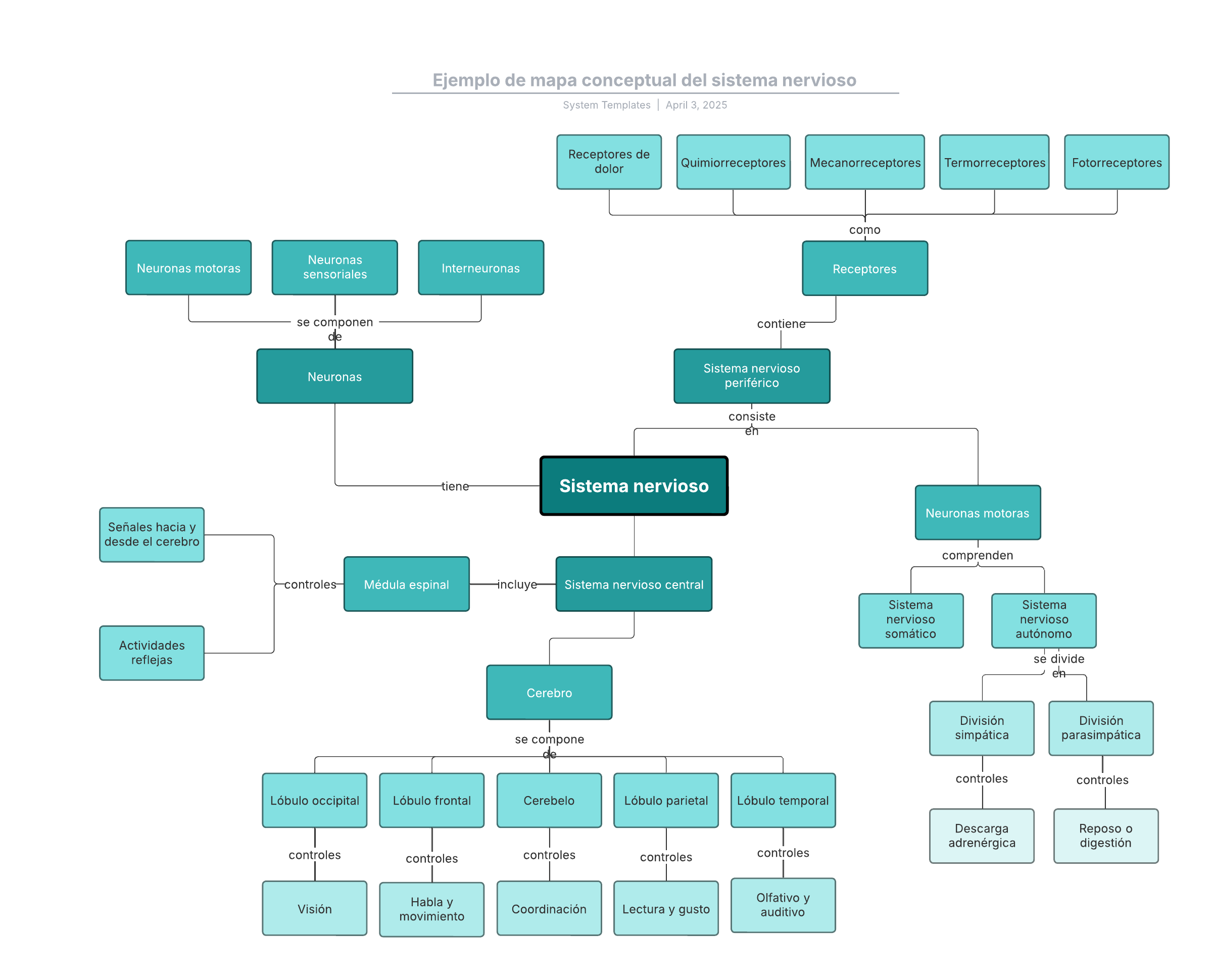 Abre esta plantilla para ver un ejemplo detallado de un mapa conceptual del sistema nervioso que puedes personalizar según tu caso de uso.