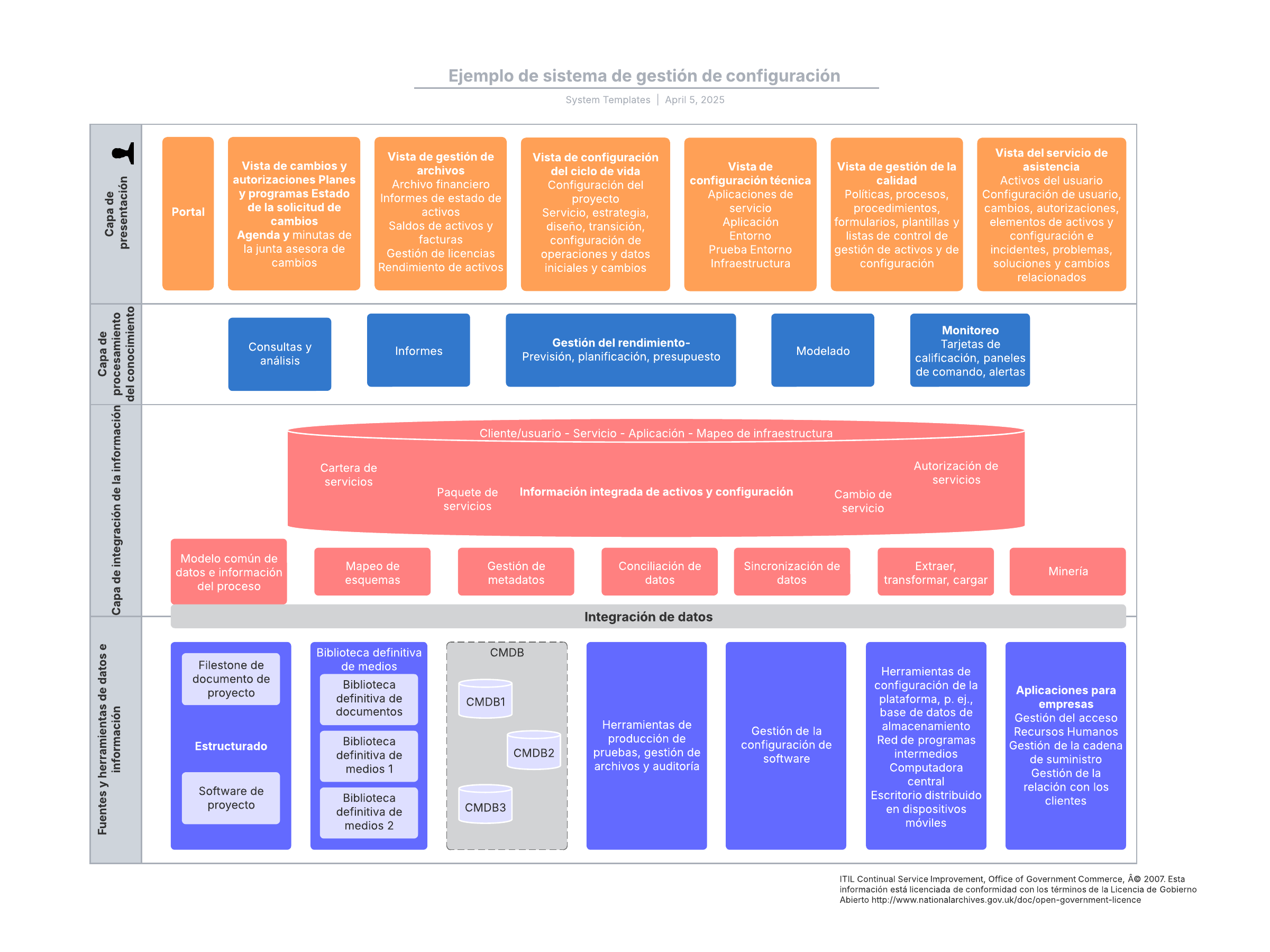 Abre esta plantilla para ver un ejemplo detallado de un diagrama de sistema de gestión de configuración que puedes personalizar según tu caso de uso.