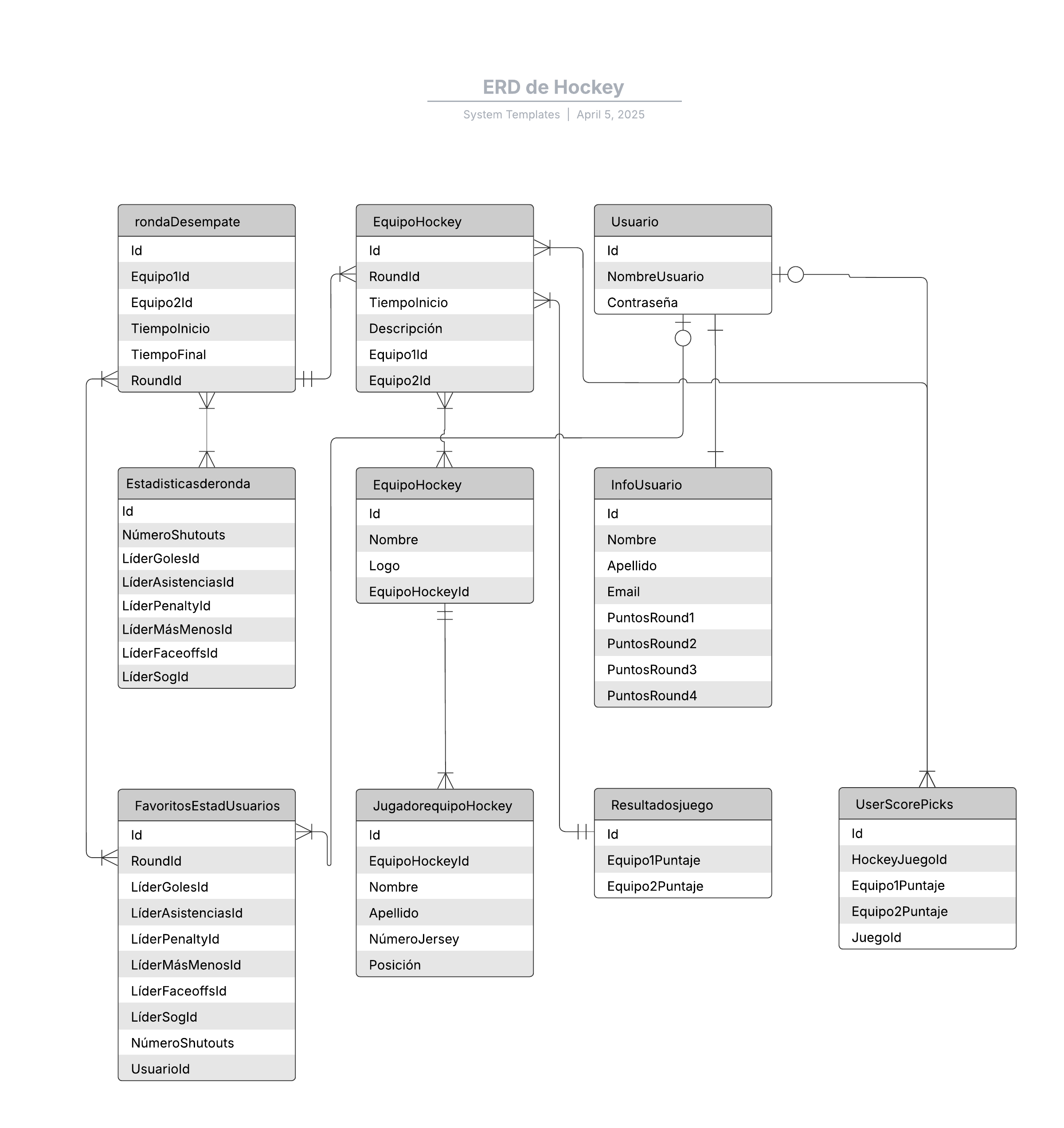 Abre esta plantilla y agrega contenido para personalizar este diagrama entidad-relación de hockey según tu caso de uso.