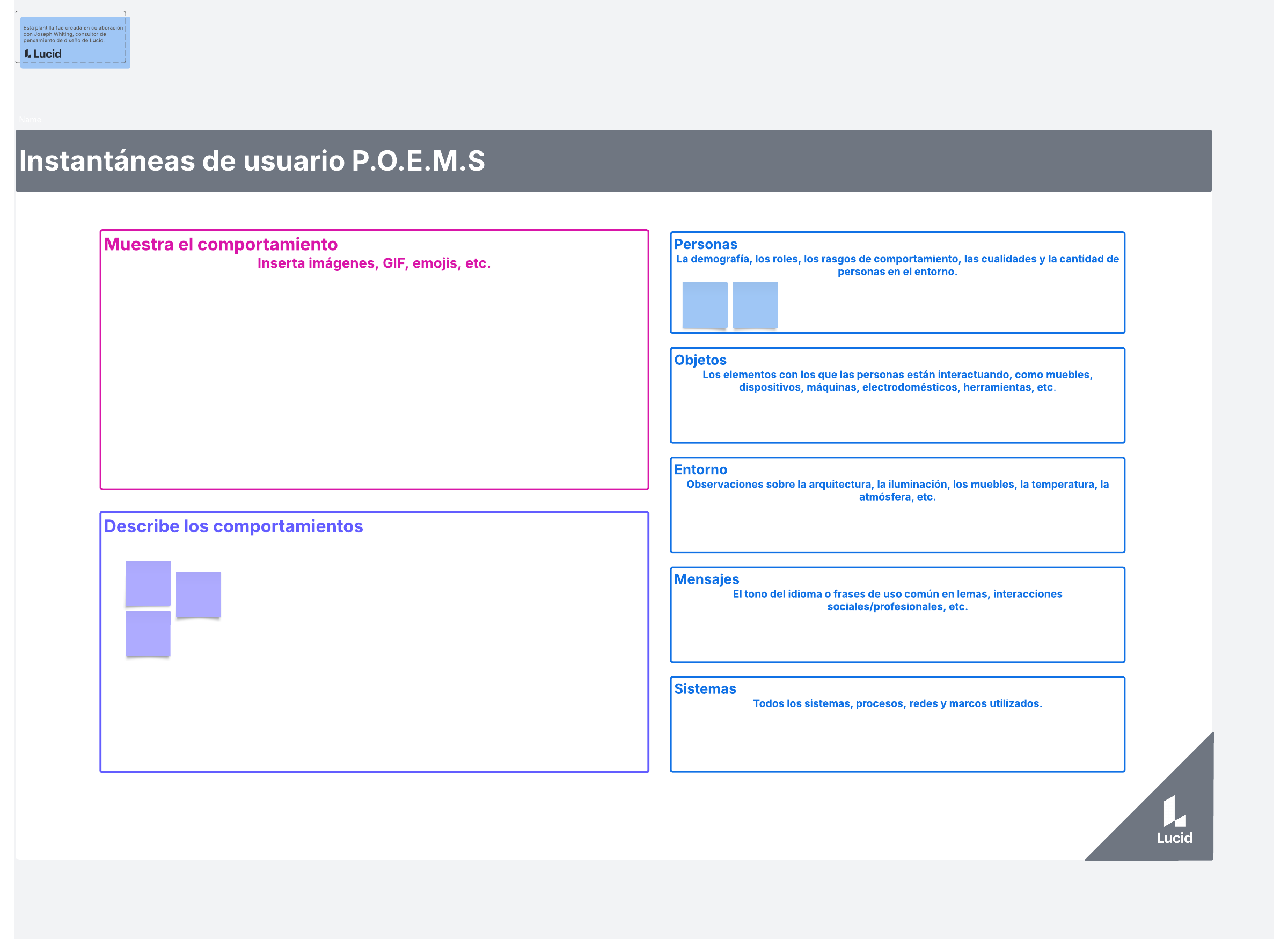 P.O.E.M.S es un marco de uso común diseñado para desarrollar una imagen detallada de los usuarios y sus experiencias. Esta plantilla en particular reemplaza "servicios" por "sistemas".