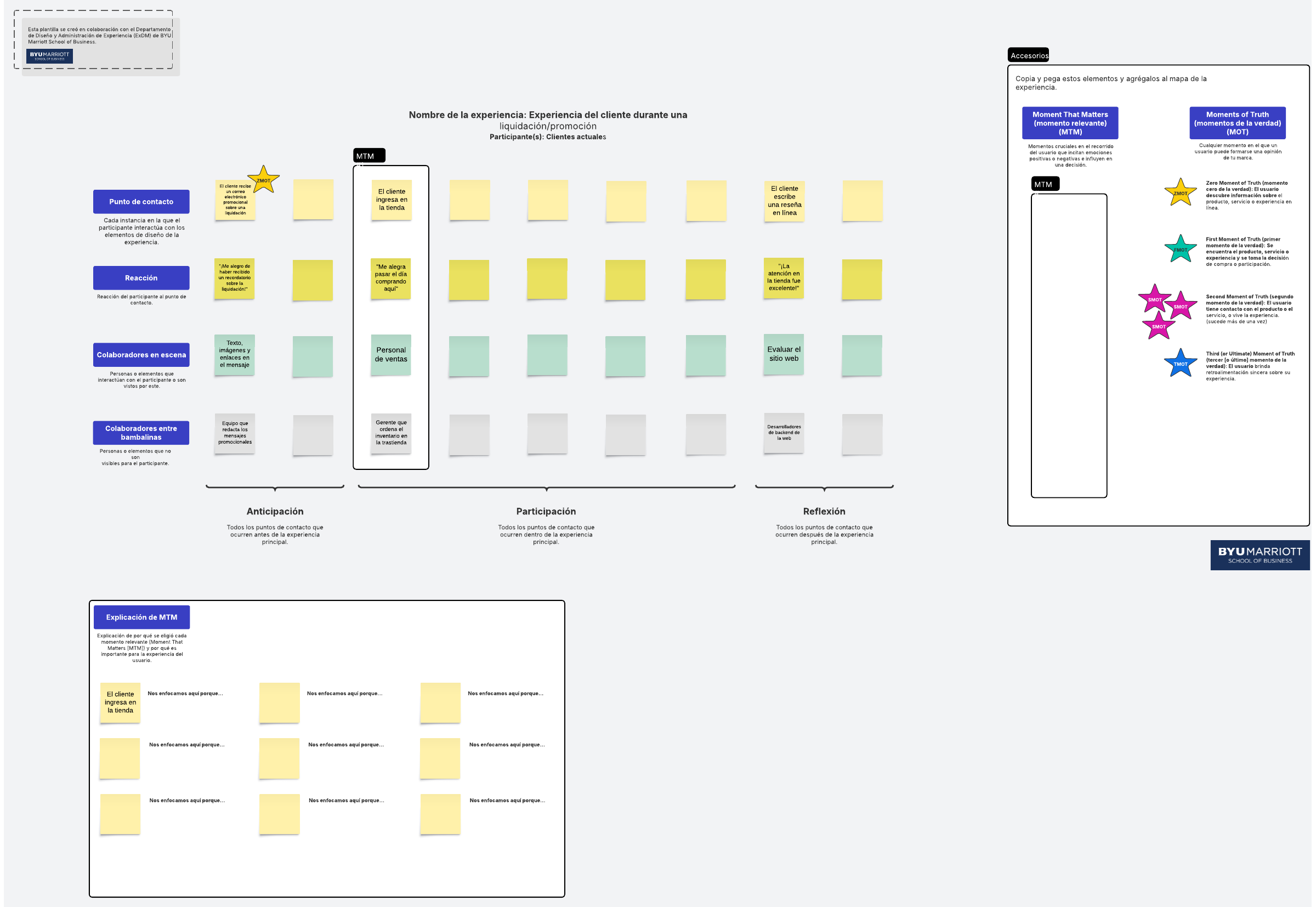 Usa este mapa de la experiencia para entender y gestionar las experiencias actuales de tus usuarios. Identifica las reacciones de los usuarios, a las personas que contribuyen en los puntos de contacto, los detalles importantes de los elementos y proporciona tu percepción sobre los “momentos relevantes” en la experiencia.