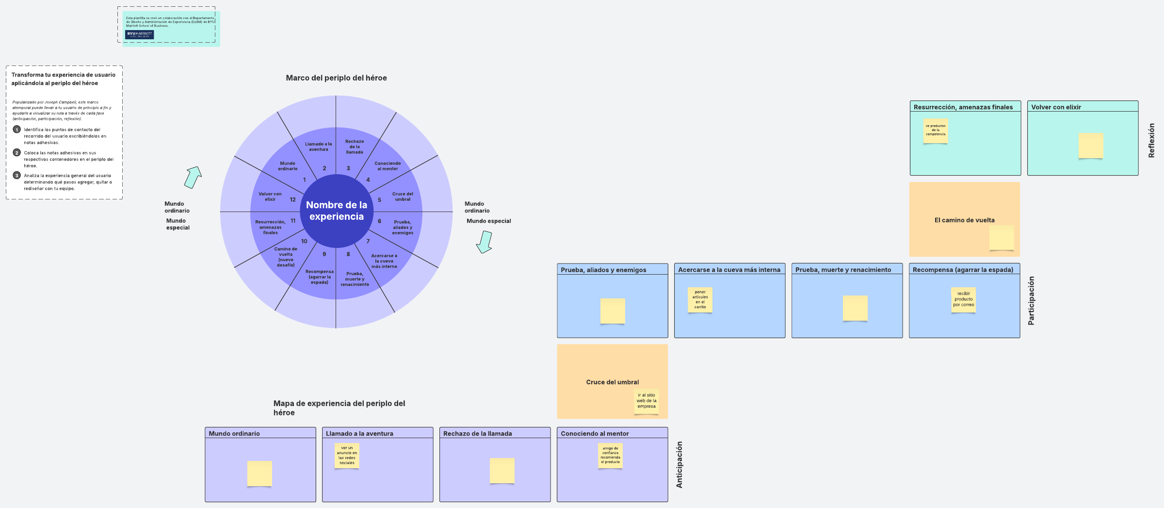 Transforma tu experiencia de usuario aplicándola al periplo del héroe. Popularizado por Joseph Campbell, este marco atemporal puede llevar a tu usuario de principio a fin y ayudarle a visualizar su ruta a través de cada fase (anticipación, participación, reflexión).