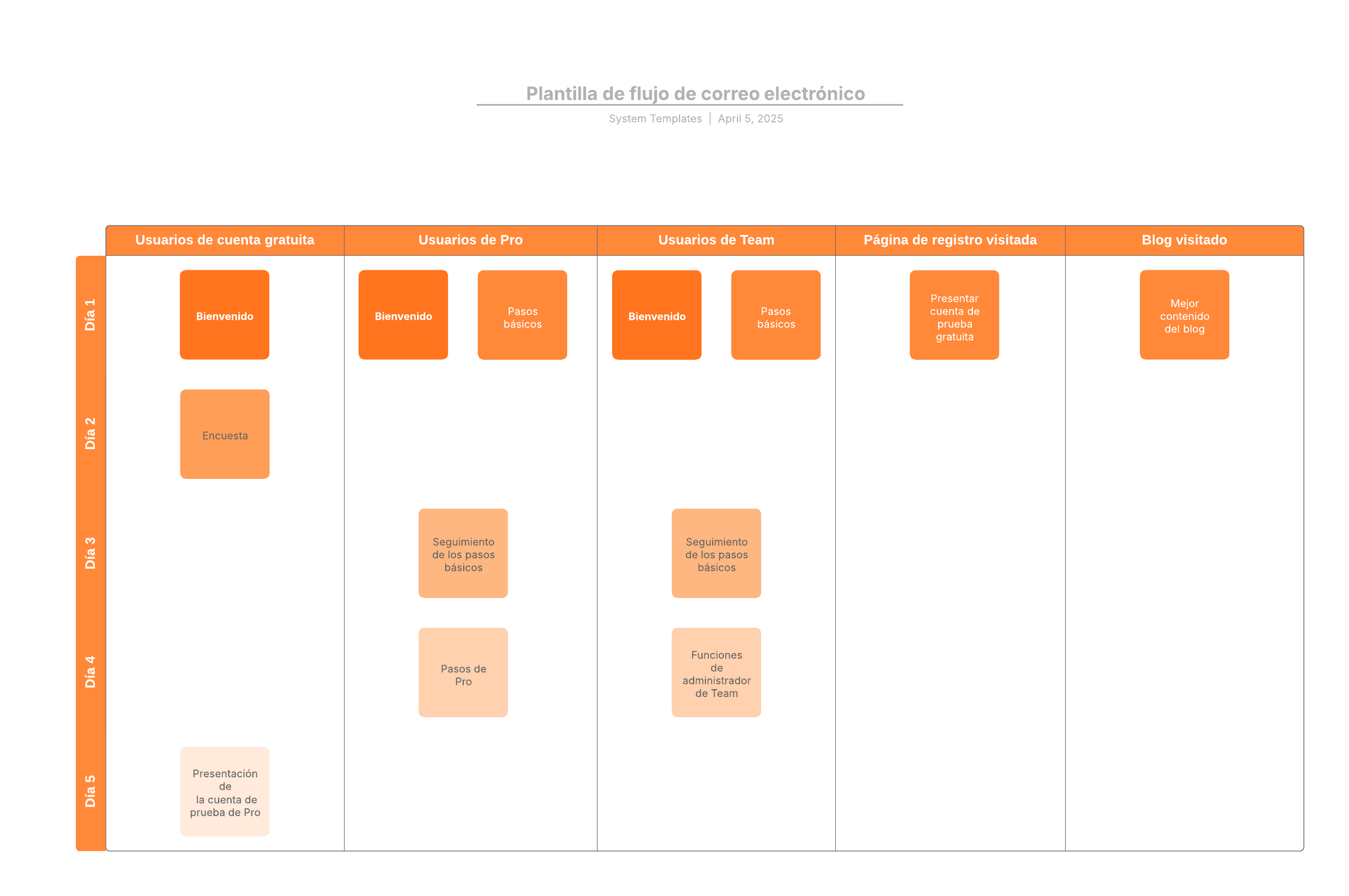 Usa esta plantilla para crear un diagrama de tu flujo de correo electrónico. Visualiza el éxito de cada campaña enviada monitoreando la actividad en todos los correos electrónicos.
