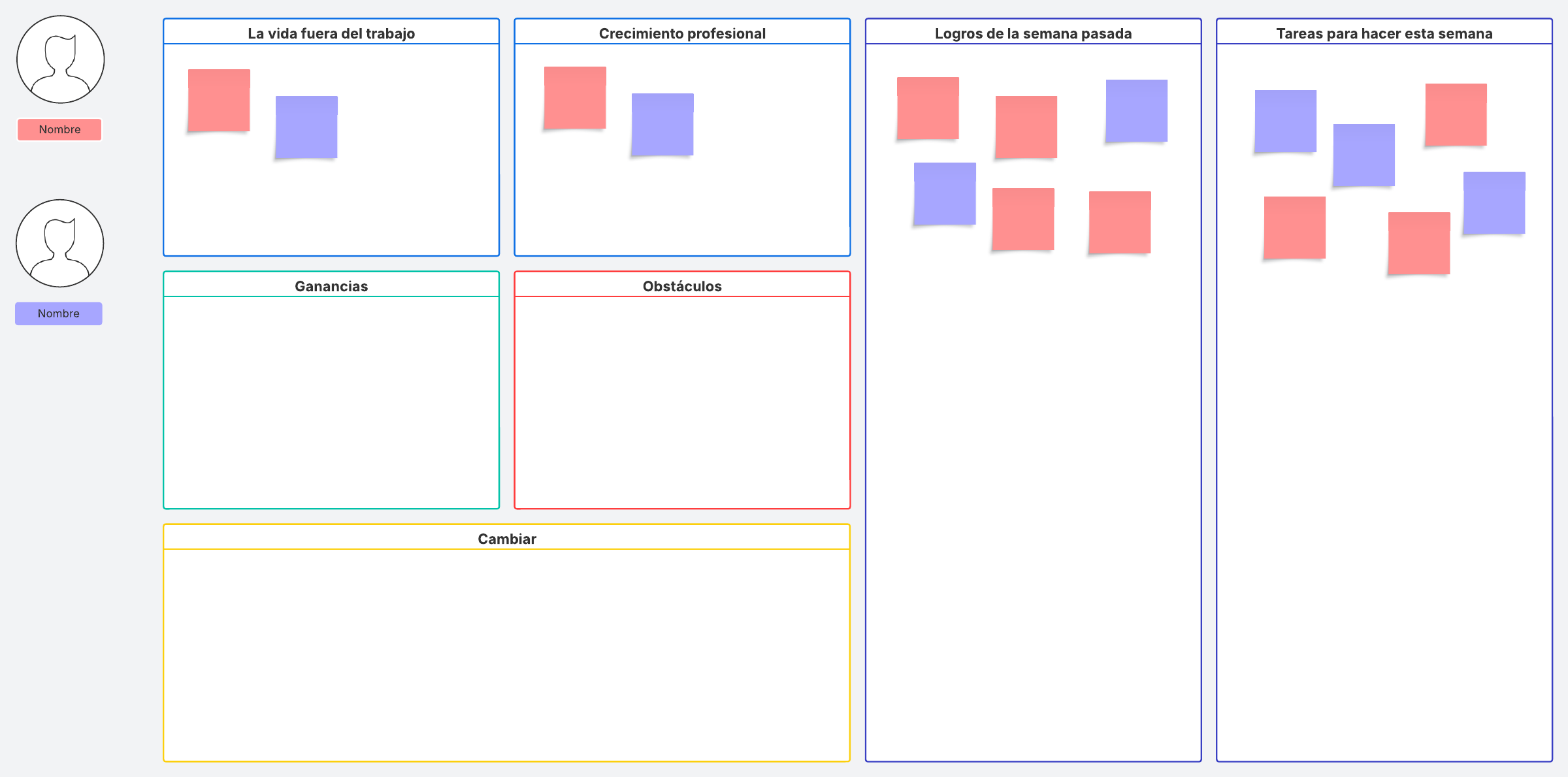 Transforma tus encuentros one to one en conversaciones verdaderamente efectivas. Nuestra plantilla de reunión 1:1 te ofrece una agenda clara para discutir desde el bienestar personal y el crecimiento profesional, hasta logros, desafíos y feedback. Controla fácilmente los avances de la semana pasada y planifica las próximas tareas clave