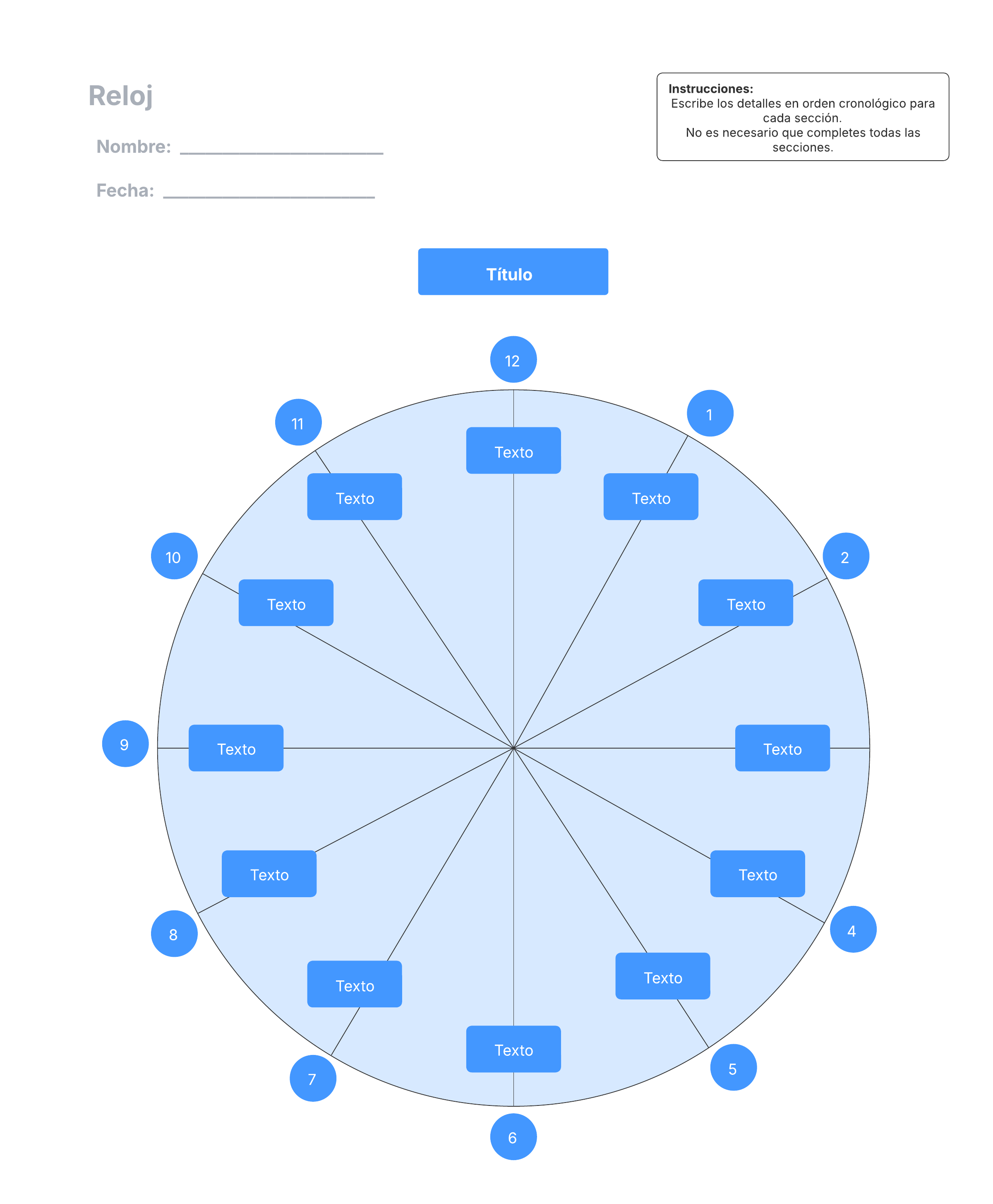 Abre esta plantilla y agrega contenido para personalizar este diagrama de reloj según tu caso de uso. Usa la versión en blanco y negro de esta plantilla para una impresión menos costosa.