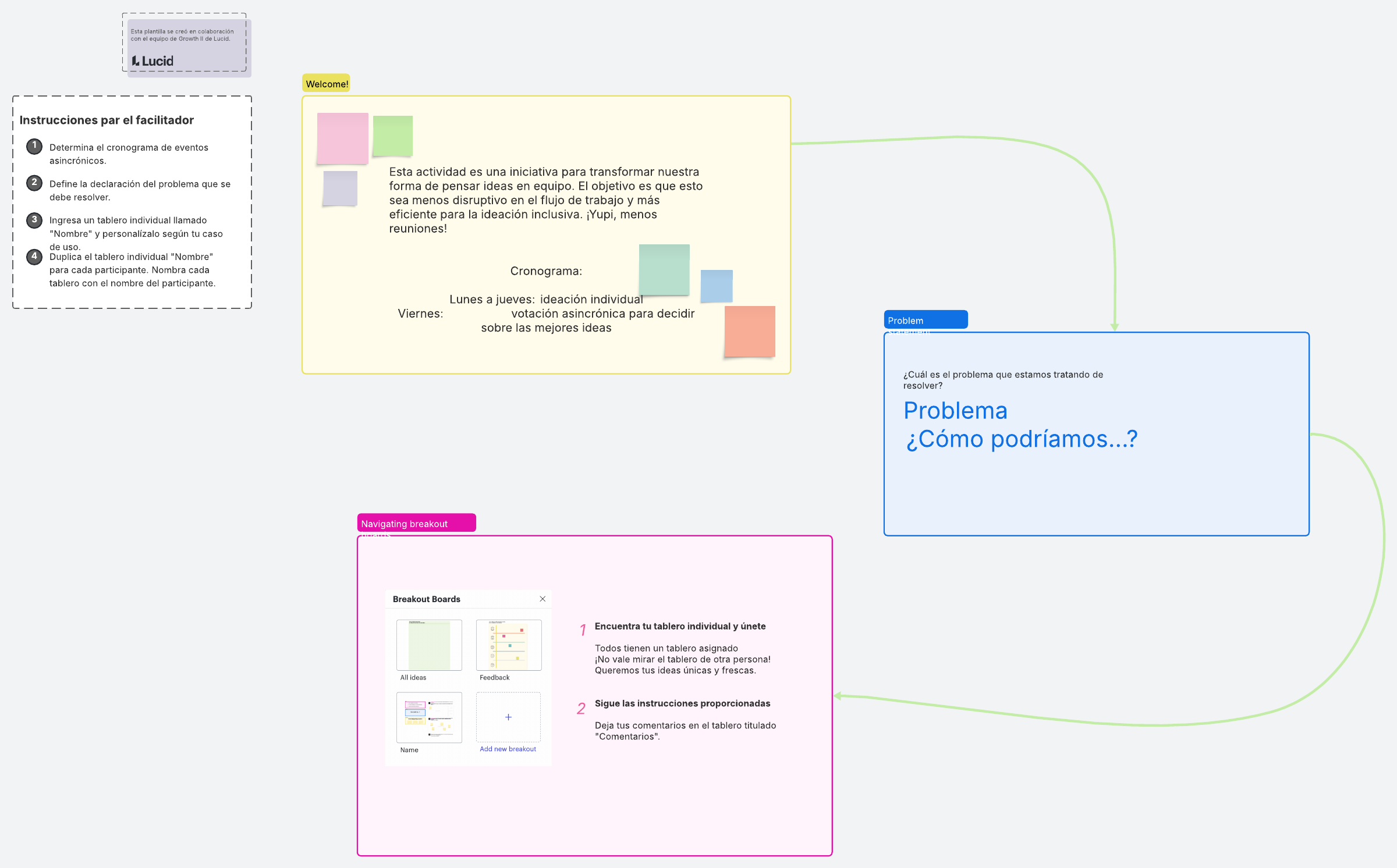 ¿Lluvia de ideas en equipo sin reuniones? ¡Sí, por favor! Esta plantilla te permite generar ideas creativas con tu equipo de forma asíncrona y 100% online. Deja atrás las reuniones agotadoras y dale a todos la libertad de contribuir en el momento que mejor les convenga. Revisa este ejemplo de una tormenta de ideas y empieza a colaborar.
